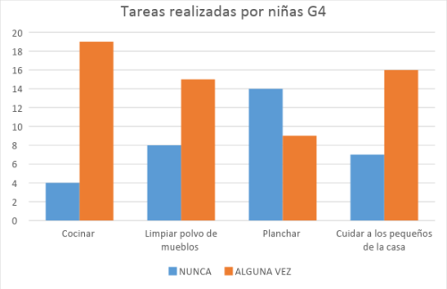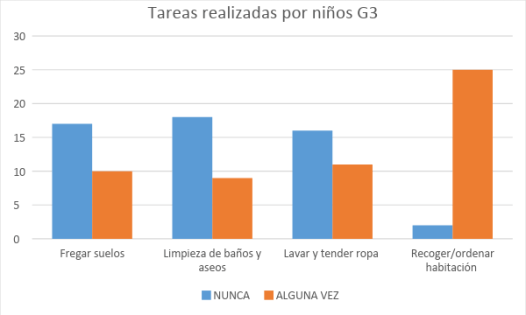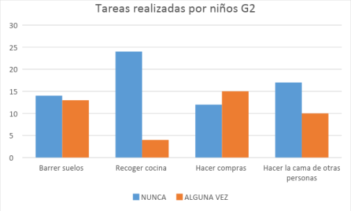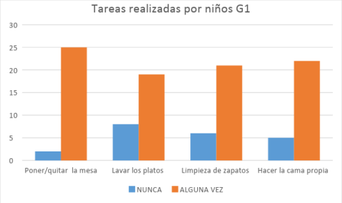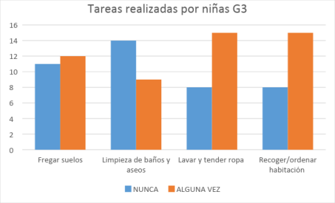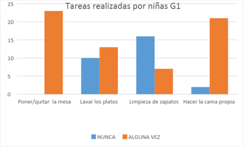Según las gráficas obtenidas, aunque no existen unas diferencias muy grandes, podemos decir que nuestra hipótesis se cumple. Las niñas hacen más tareas domésticas que los niños. Pero debemos decir que los niños muestran que también participan en estas tareas.