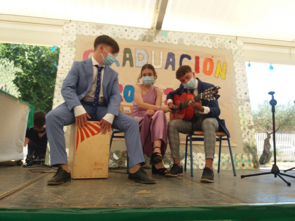 Como no puede faltar la música en nuestras celebraciones, en este caso estuvo a cargo de José Ángel Muñiz y Esteban Valero, quienes nos deleitaron con dos interpretaciones: “Entre dos aguas” y “Bulerías”. ¡Muchísimas gracias a ellos! También nos dieron una sorpresa muy agradable nuestra Jefa de Estudios, Rosa Cuenca y el Profesor Iván Valero, al reinterpretar la canción de Nino Bravo “Libre”, que nos hizo tararearla y arrancar enormes sonrisas.