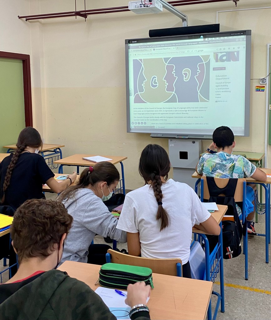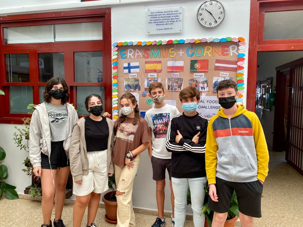 Con motivo del Día Europeo de las Lenguas que se celebra cada año el 26 de septiembre, el alumnado de 3ºESO C y D ha elaborado unos bocadillos con los saludos en los idiomas hablados en el proyecto Erasmus + ‘Real Fooding Challenge’ que se está desarrollando en nuestro centro: inglés, español, polaco, finés, letón y portugués. Después, los estudiantes que viajarán a finales de Octubre a Moimenta da Beira han pegado los carteles alrededor del tablón de Erasmus + corner y se han hecho la foto de grupo.