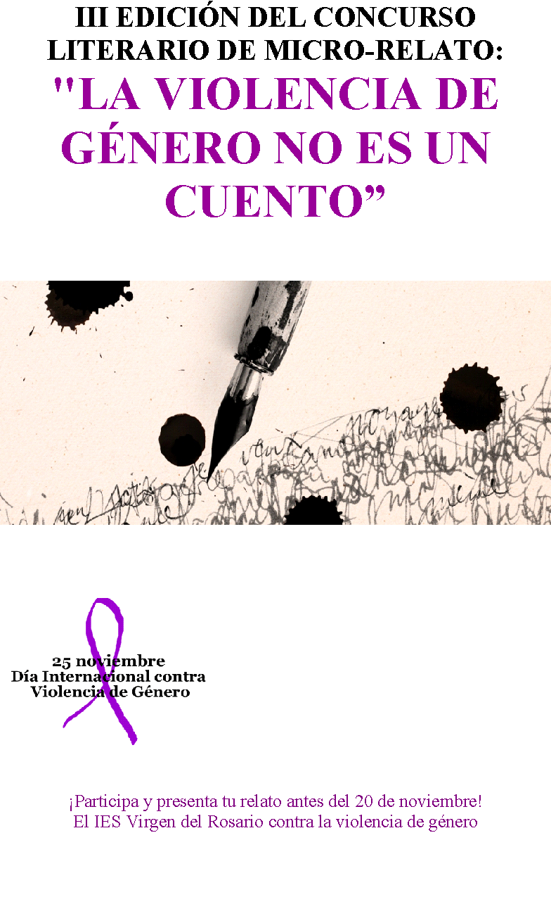 1.- El área de Coeducación IES Virgen del Rosario convoca la III Edición del Concurso literario de Micro-relatos contra la Violencia de Género en la adolescencia y juventud. El lema es “La violencia de género no es un cuento”, con motivo de la conmemoración del Día Internacional para combatir la Violencia contra las Mujeres y educar en Igualdad (25 de noviembre).