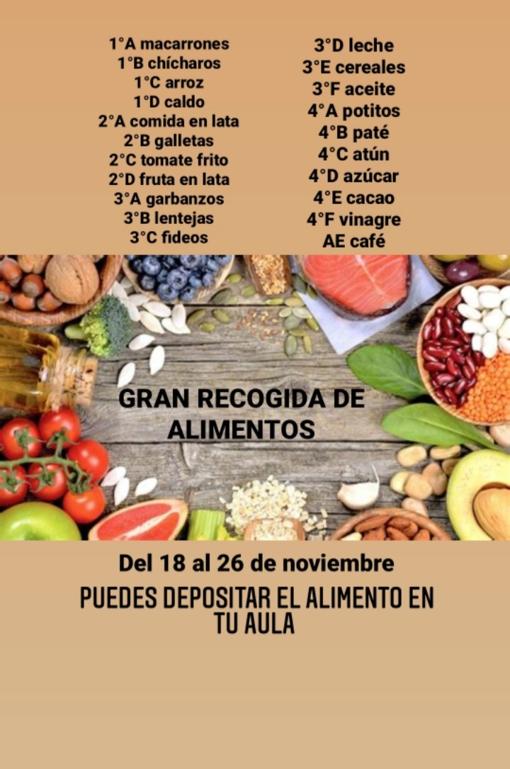 El grupo de 2ºA de la asignatura de Religión organiza esta campaña. Cada grupo puede colaborar con el alimento indicado para asegurar la variedad.Pueden depositarlo en sus aulas. El viernes 26 se realizará la recogida.¡Sé solidario! ¡Colabora!