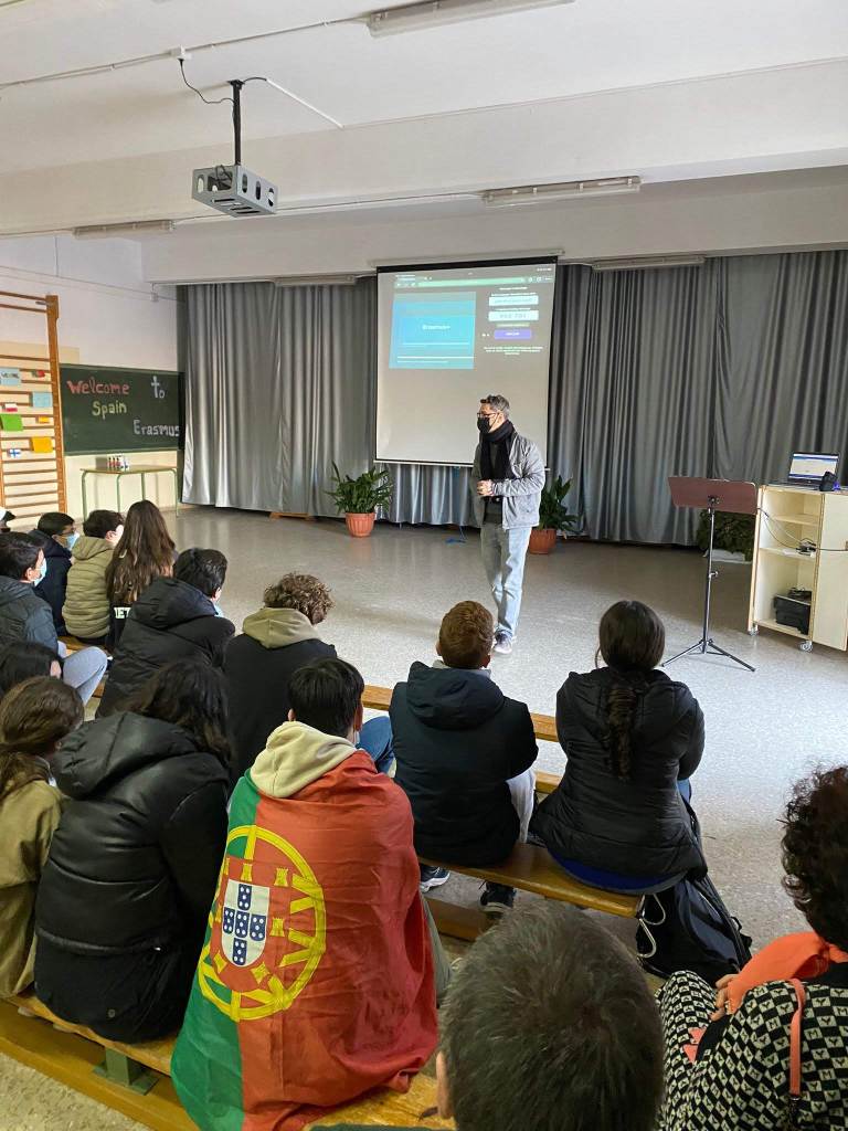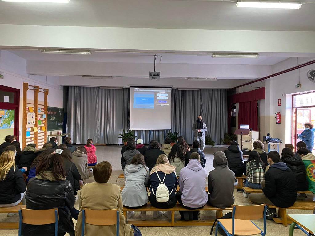 El primer día de la visita, los estudiantes de nuestro centro dieron la bienvenida al alumnado extranjero en el SUM, que fue decorado con banderas y cartulinas para la ocasión, y explicaron aspectos de nuestra cultura y gastronomía, además de presentarles nuestro centro. Acto seguido, nuestro director, Bruno Rivera, hizo lo mismo además de realizar un Quizizz muy divertido donde tanto el alumnado español como el extranjero aprendió aspectos importantes de cada país. Después, todo el alumnado junto con sus profesores y profesoras dieron un paseo por el pueblo y visitaron el ayuntamiento, donde el alcalde les recibió. Por último, volvieron al centro y jugaron a Ultimate, uno de los deportes alternativos que recoge nuestro proyecto.