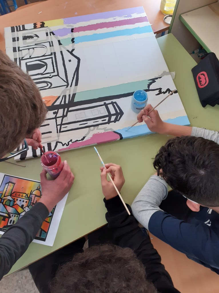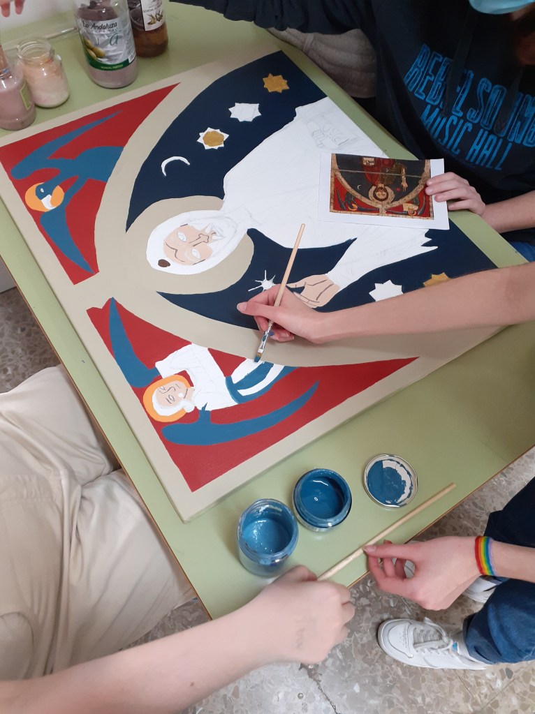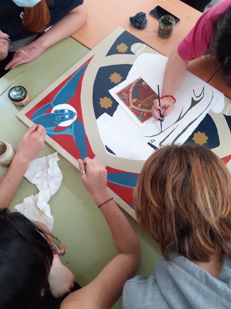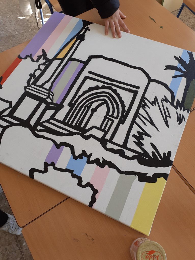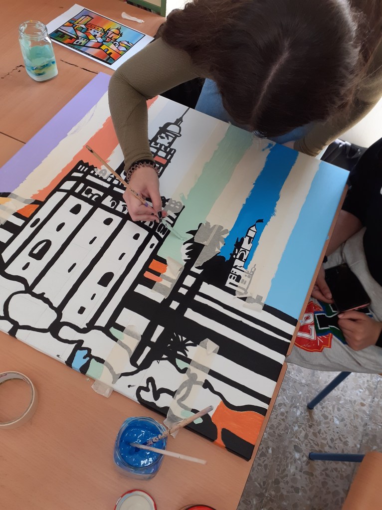 Los alumnos/as de plástica de 4ºESO ya han comenzado la realización de los murales que, como cada curso escolar, formarán parte de la decoración de nuestro centro. Este año, los trabajos elaborados tendrán un triple objetivo: dichas obras estarán íntimamente relacionadas con el programa «Vivir y sentir el patrimonio», formarán parte de nuestro proyecto de mejora estética y se trabajarán los contenidos impartidos en la unidad didáctica sobre las vanguardias artísticas del siglo XX. Estamos realizando un Pantocrátor y tres paisajes, en los cuales aparecerán la Torre del Oro (Sevilla), la Ermita de Cuatrovitas (Bollullos de la Mitación) y la Ermita de Castilleja de Talhara (Benacazón), obras del medievo que se reinterpretarán en un estilo fauvista, ya que nuestra intención es hacer un homenaje al artista Massa Solís.