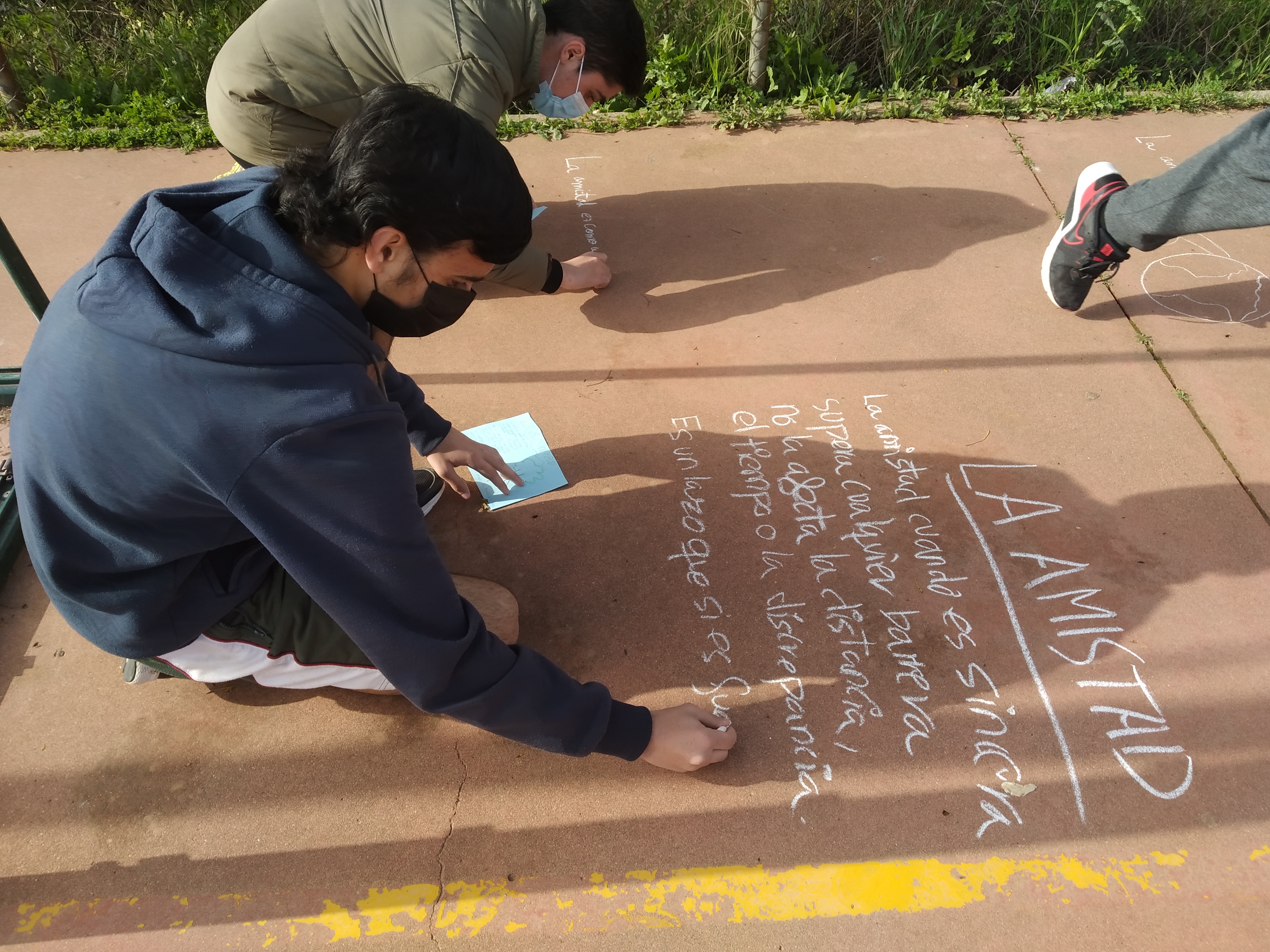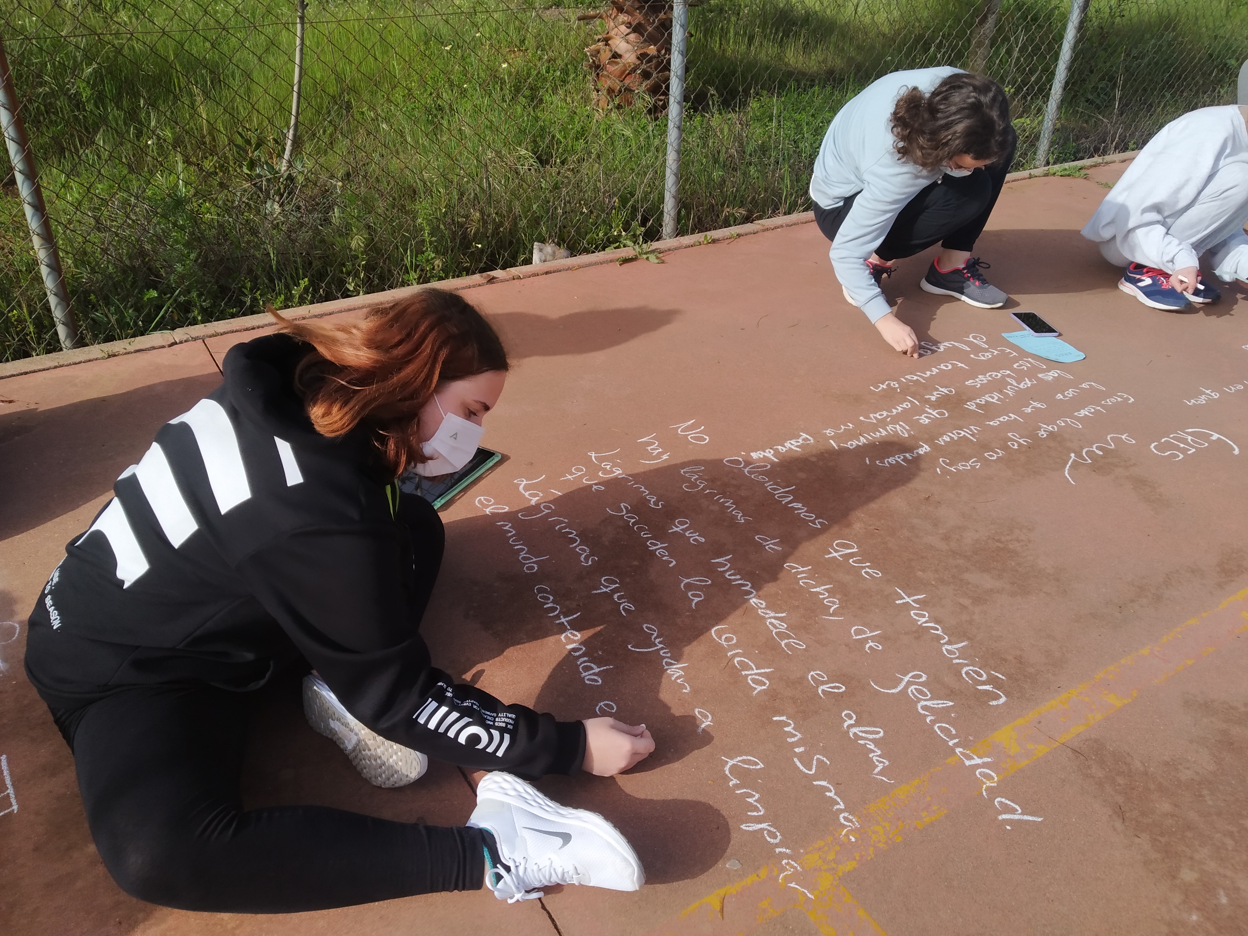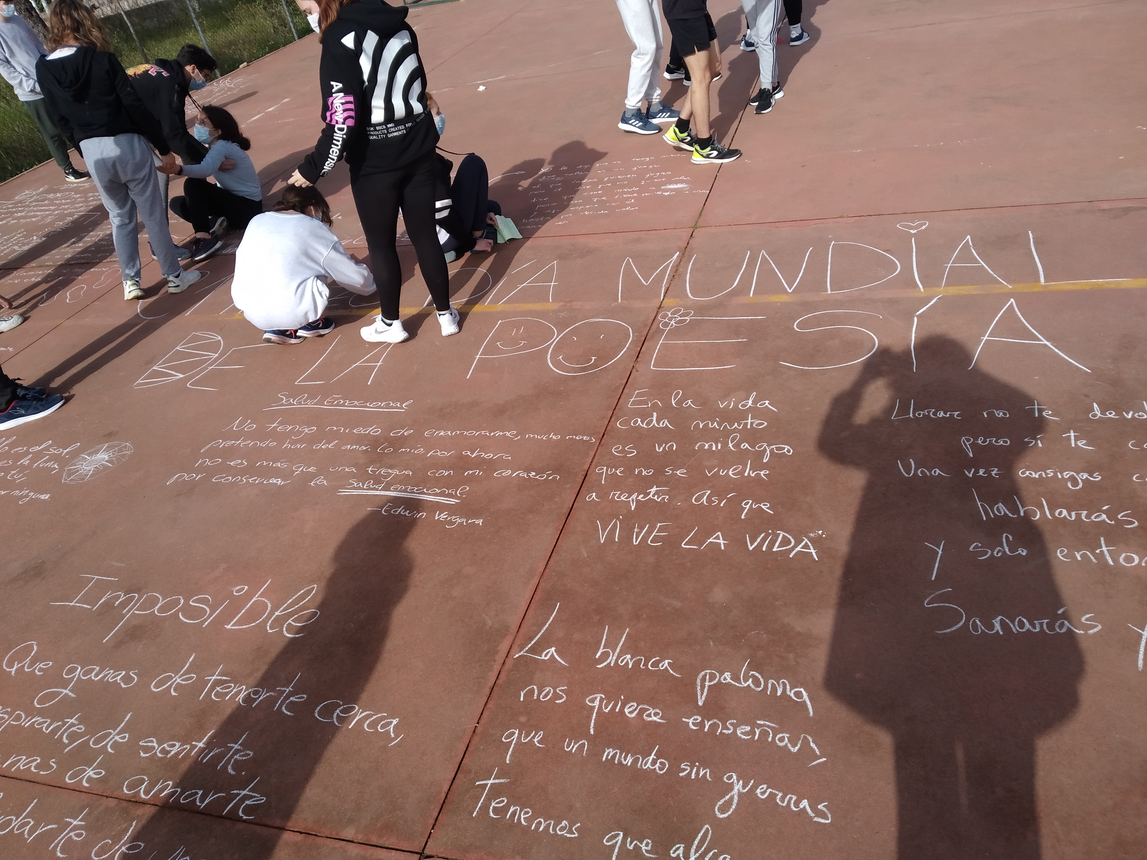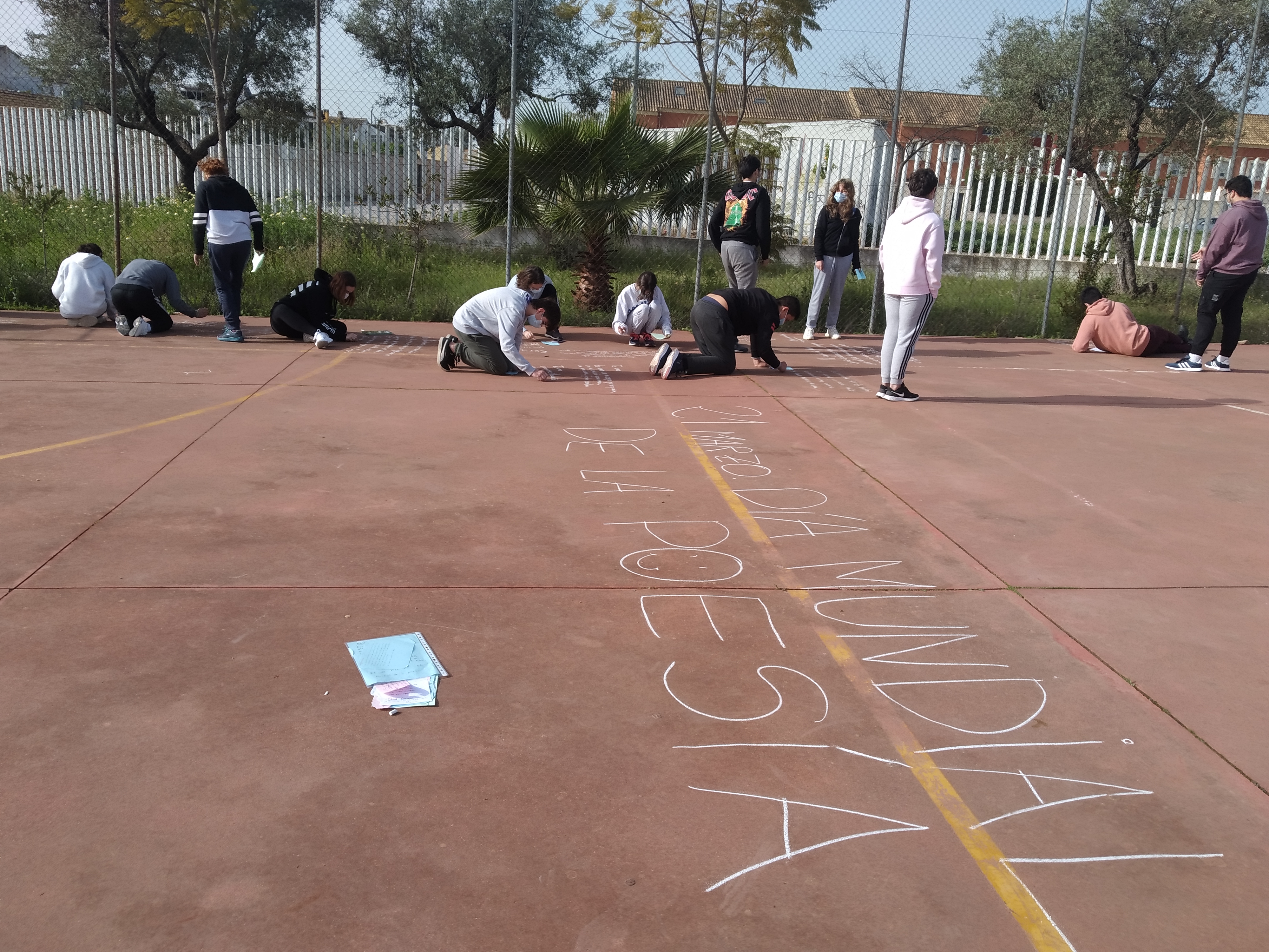 El alumnado del Club de Lectura Coeducativo con su coordinadora Inma Navarro han conmemorado el 21 de marzo, Día Mundial de la Poesía, con la actividad “Raining Poetry”. La idea de la actividad es hacer una lluvia de poemas por todo el instituto, escribiendo poesías con tizas en las pistas y colgando poemas que previamente hemos escrito en hojas de colores. El objetivo es dar a conocer la poesía entre las/os jóvenes lectoras/es y motivar al alumnado a la lectura de la poesía, cómo manifestar tanta belleza por medio de la palabra en verso.