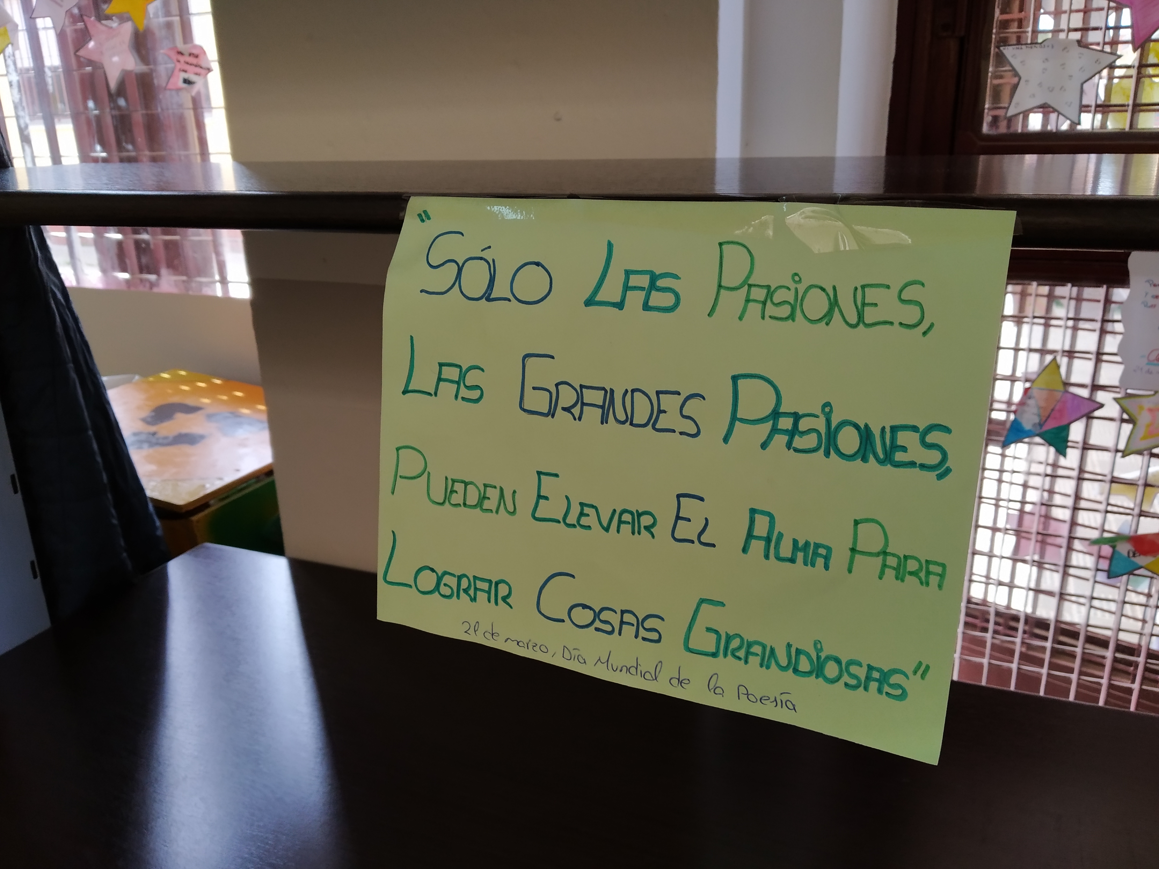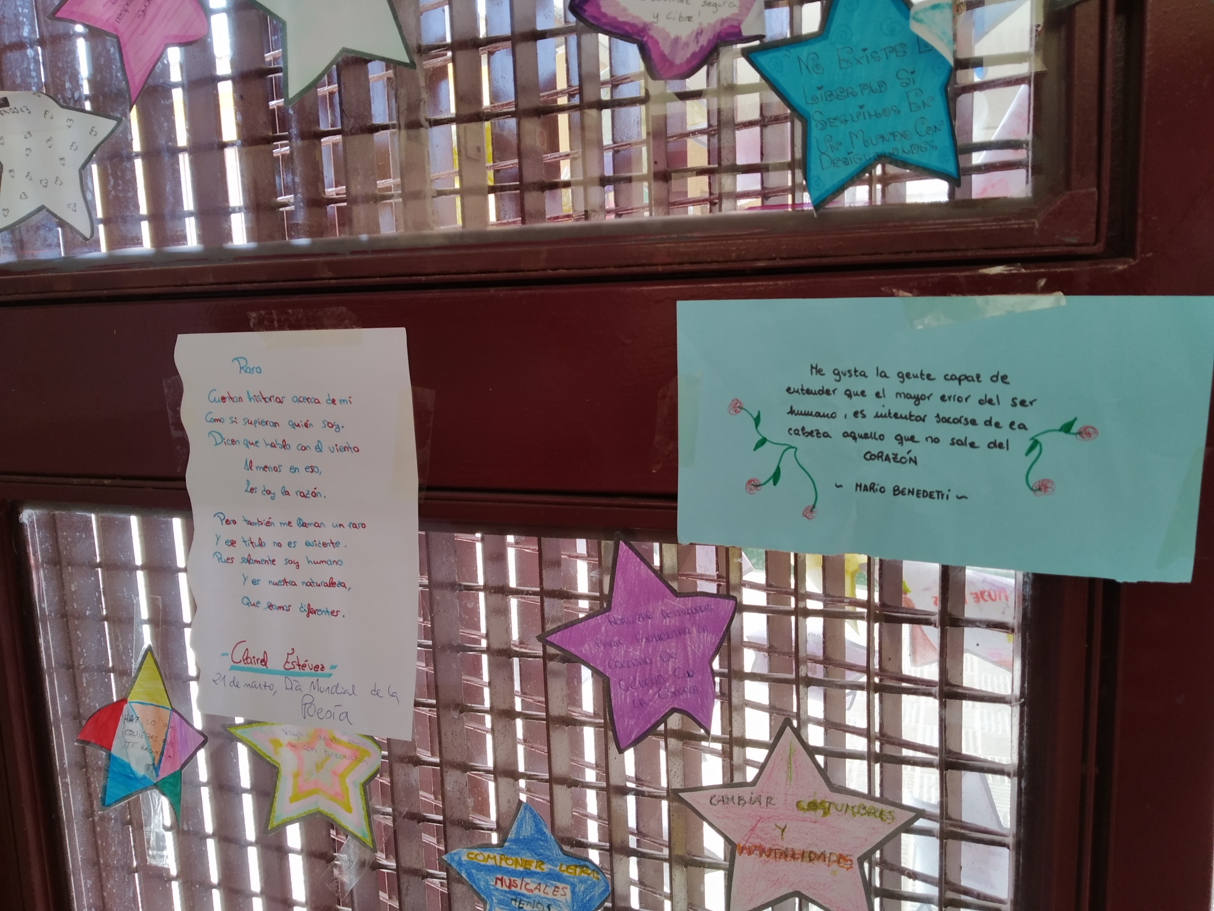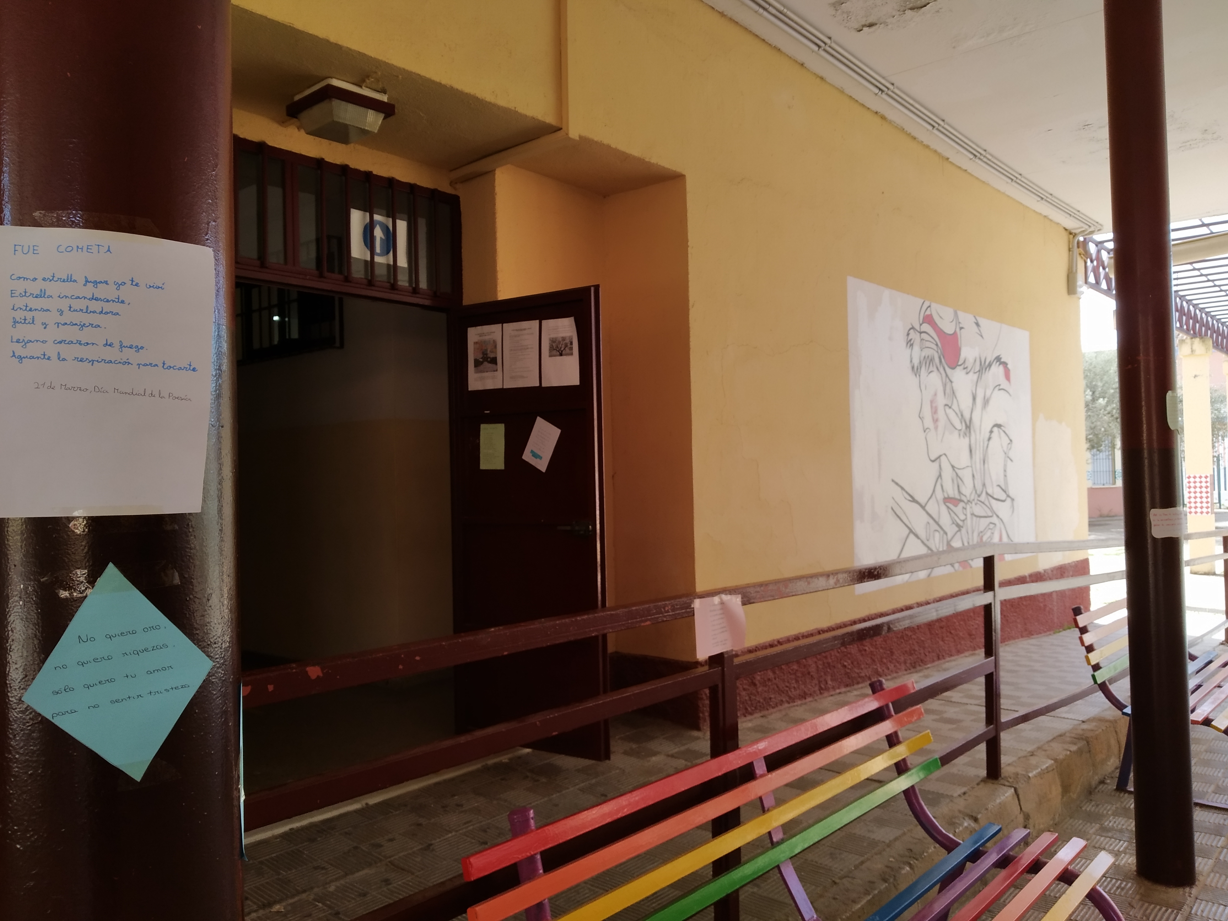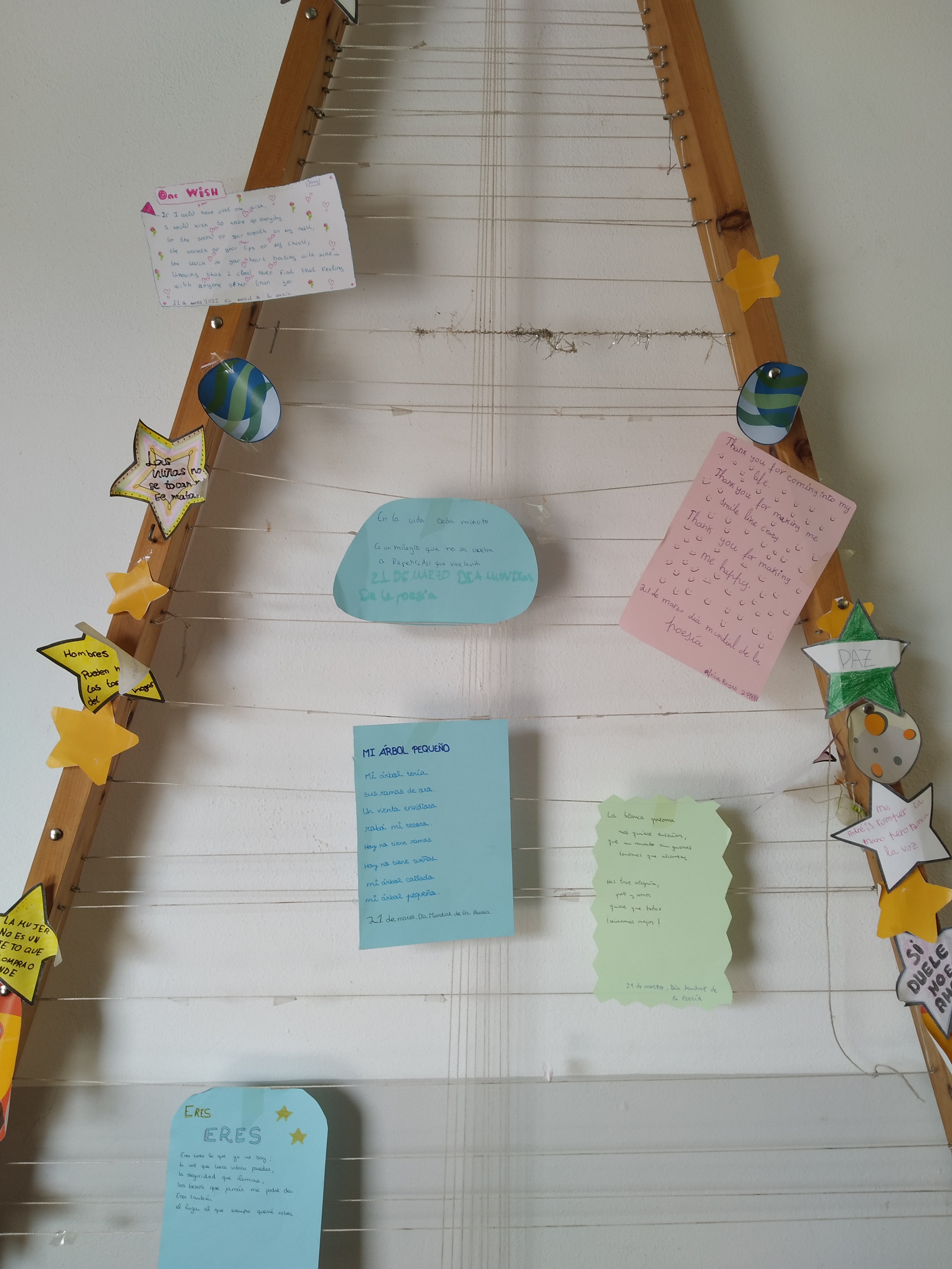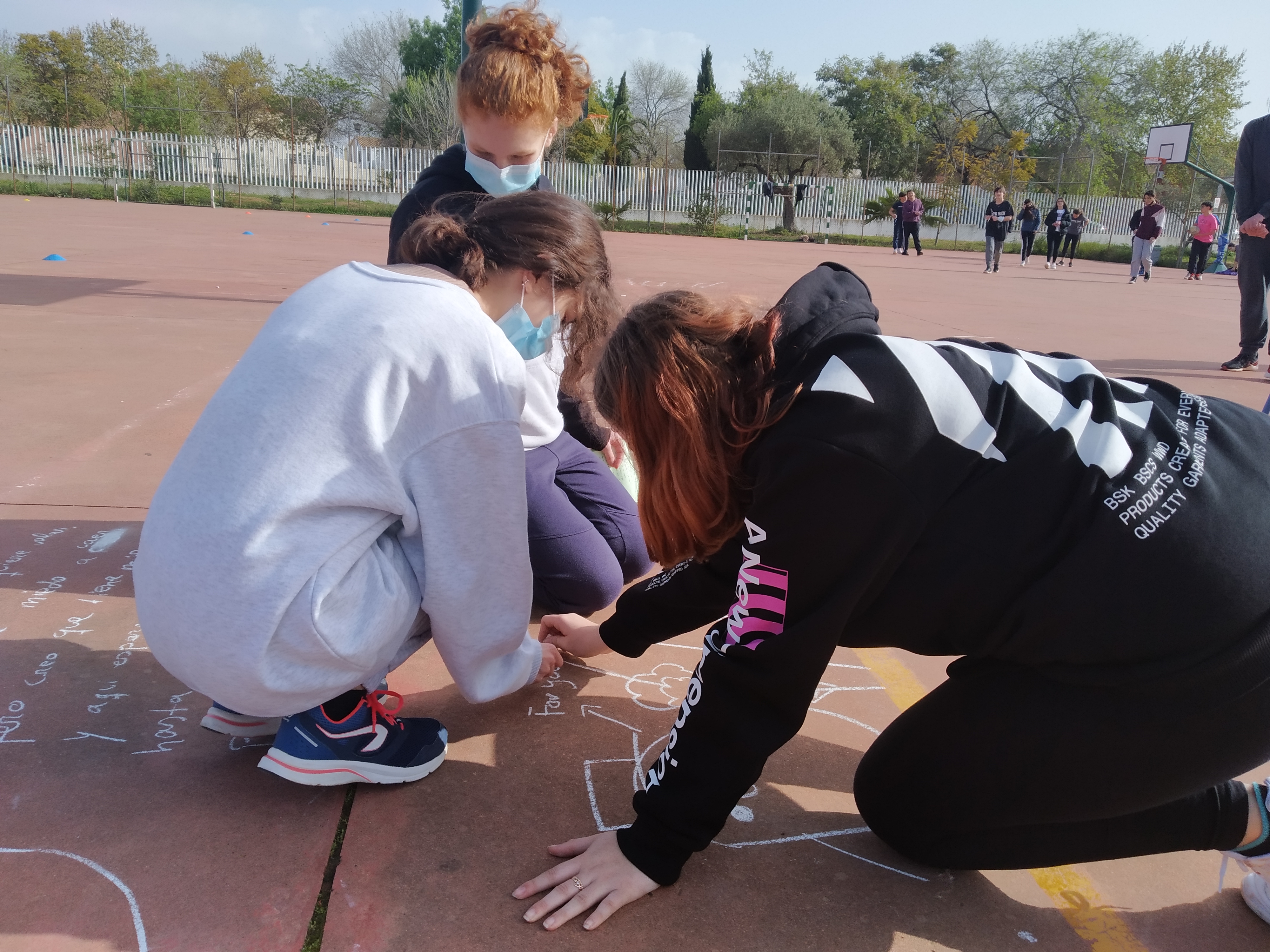 El alumnado del Club de Lectura Coeducativo con su coordinadora Inma Navarro han conmemorado el 21 de marzo, Día Mundial de la Poesía, con la actividad “Raining Poetry”. La idea de la actividad es hacer una lluvia de poemas por todo el instituto, escribiendo poesías con tizas en las pistas y colgando poemas que previamente hemos escrito en hojas de colores. El objetivo es dar a conocer la poesía entre las/os jóvenes lectoras/es y motivar al alumnado a la lectura de la poesía, cómo manifestar tanta belleza por medio de la palabra en verso.