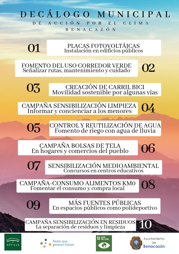 Para conseguir dicho objetivo de concienciación/sensibilización, el grupo de jóvenes de 4° de la asignatura Cultura Científica impartida por la profesora Viviana Griguol, coordinado por la Agente de Dinamización Juvenil del Ayuntamiento de Benacazón, Pastora Rivera y con la asesoría de expertos de Argos subvencionados por la Diputación de Sevilla, han celebrado diversas sesiones de trabajo a través de una serie de dinámicas (presenciales y online) de análisis, exposición y debate culminando el proceso con la redacción de un Decálogo municipal de medidas que contribuyan a frenar el cambio climático en el municipio, que presentaron en una Sesión Plenaria en el Ayuntamiento de Benacazón el pasado 23 de mayo a la cual asistieron el Sr Alcalde Pedro Oropesa y las Concejalas de Juventud: Carmen Rocío Bautista, de Educación: Soledad Bautista, de Medio Ambiente: Mercedes Espinosa, así como otros representantes del Municipio.Así mismo también han trabajado en una Campaña de Difusión con diversos contenidos con el objetivo de llegar a toda la población del municipio, que en breve se divulgarán.