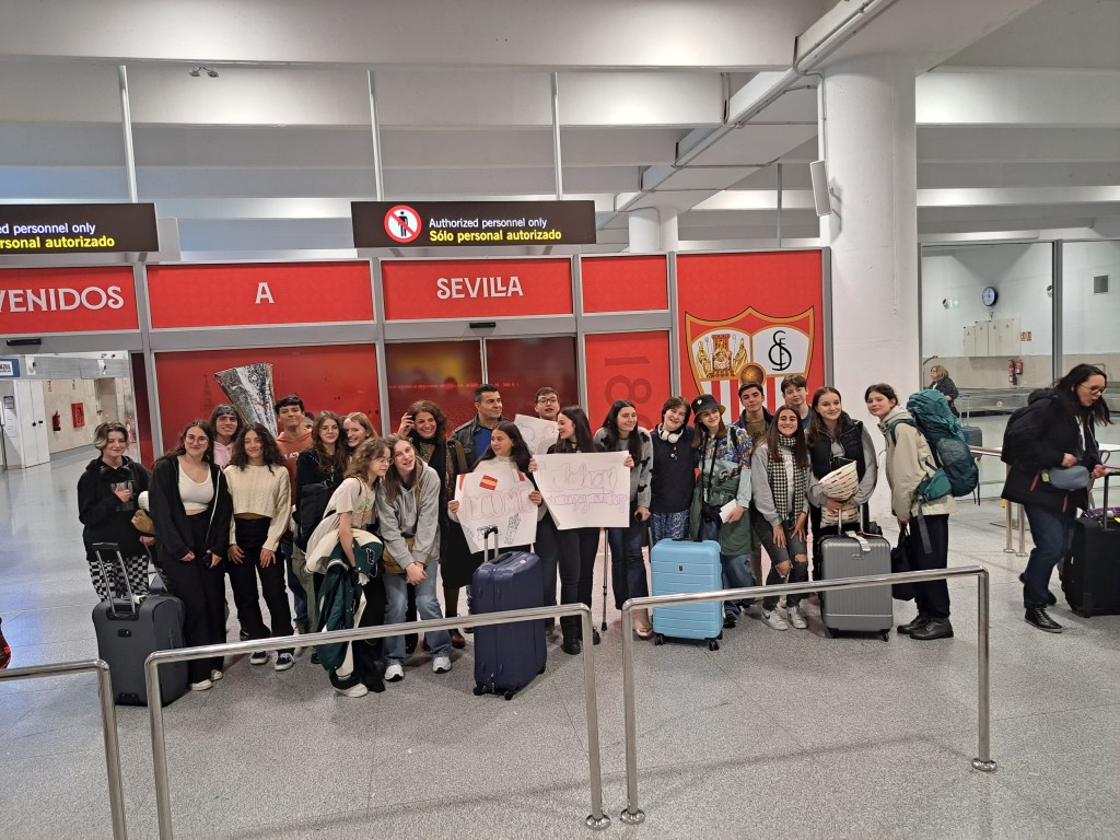 El domingo 5 de marzo los padres y madres de nuestro alumnado, y el profesorado responsable recogen a la comunidad polaca Erasmus + en el Aeropuerto de San Pablo de Sevilla. Vuelo que estaba previsto llegar a las 21:00 horas, y debido a un retraso llega a las 22:10. El grupo español acoge con gran entusiasmo y efusividad a los miembros del instituto procedente de Polonia para después, cada familia, llevarse a su huésped a casa durante toda la semana.