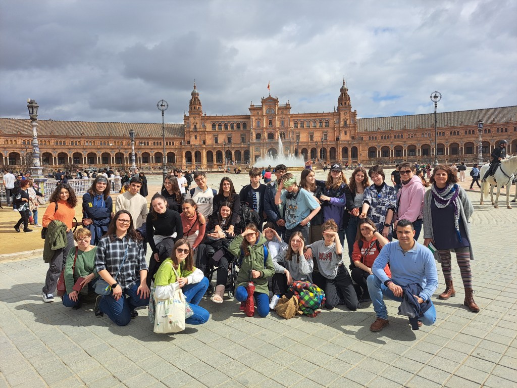 El martes 7, el profesorado polaco aún estaba degustando el espectáculo flamenco de la tarde del lunes en en Barrio de Santa Cruz, cuando de nuevo, esta vez con todo el alumnado, se pone rumbo a Sevilla. En la ciudad Hispalense el alumnado conoce distintos personajes sevillanos y su obra, así como distintas leyendas ligadas al Barrio de Santa Cruz a través de una ruta teatralizada que comienza en los Jardines de Murillo y que desemboca en la Plaza del triunfo. Allí contemplan con asombro el Alcázar, la Catedral y su maravilloso minarete con terminación renacentista: la Giralda. Tras un breve descanso el grupo Erasmus se encamina a la Plaza de España. Allí se reparten placas bici de distintos colores, de la Plataforma Carril Bici y la Asociación Acontramano, para fomentar el uso de la bicicleta como medio de transporte saludable y sostenible.