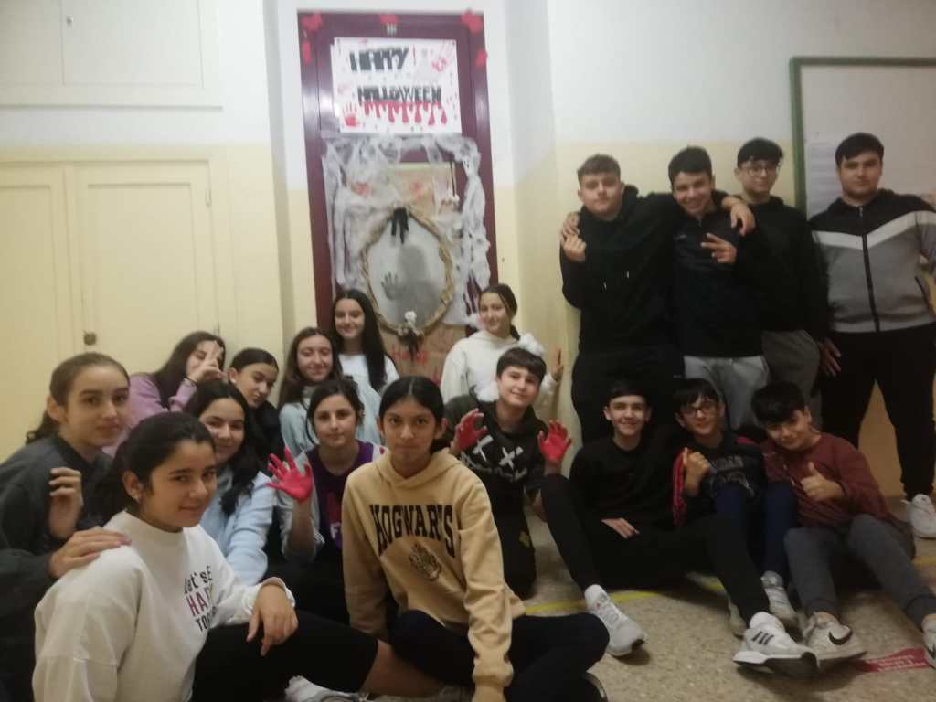aulas junto al profesorado, con una frase terrorífica en inglés, reutilizando