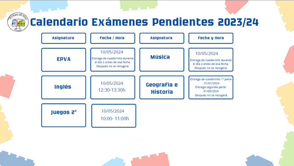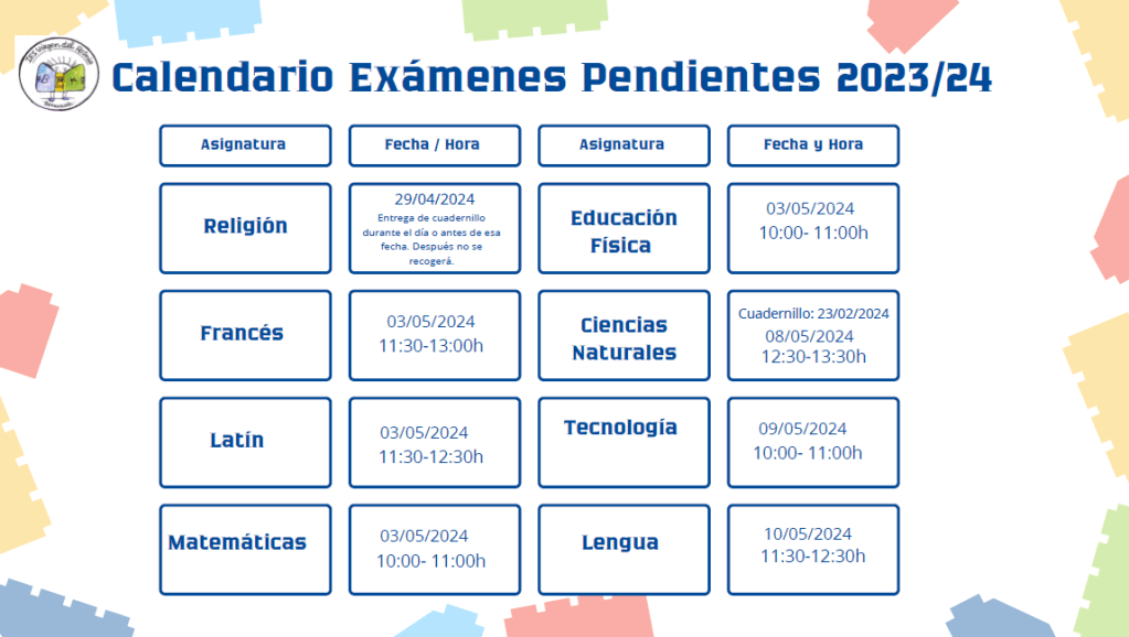 Éste es el calendario de las asignaturas pendientes para el Curso 2023/24. Recordad que las materias pendientes son una asignatura más y que cuentan para la promoción y titulación.