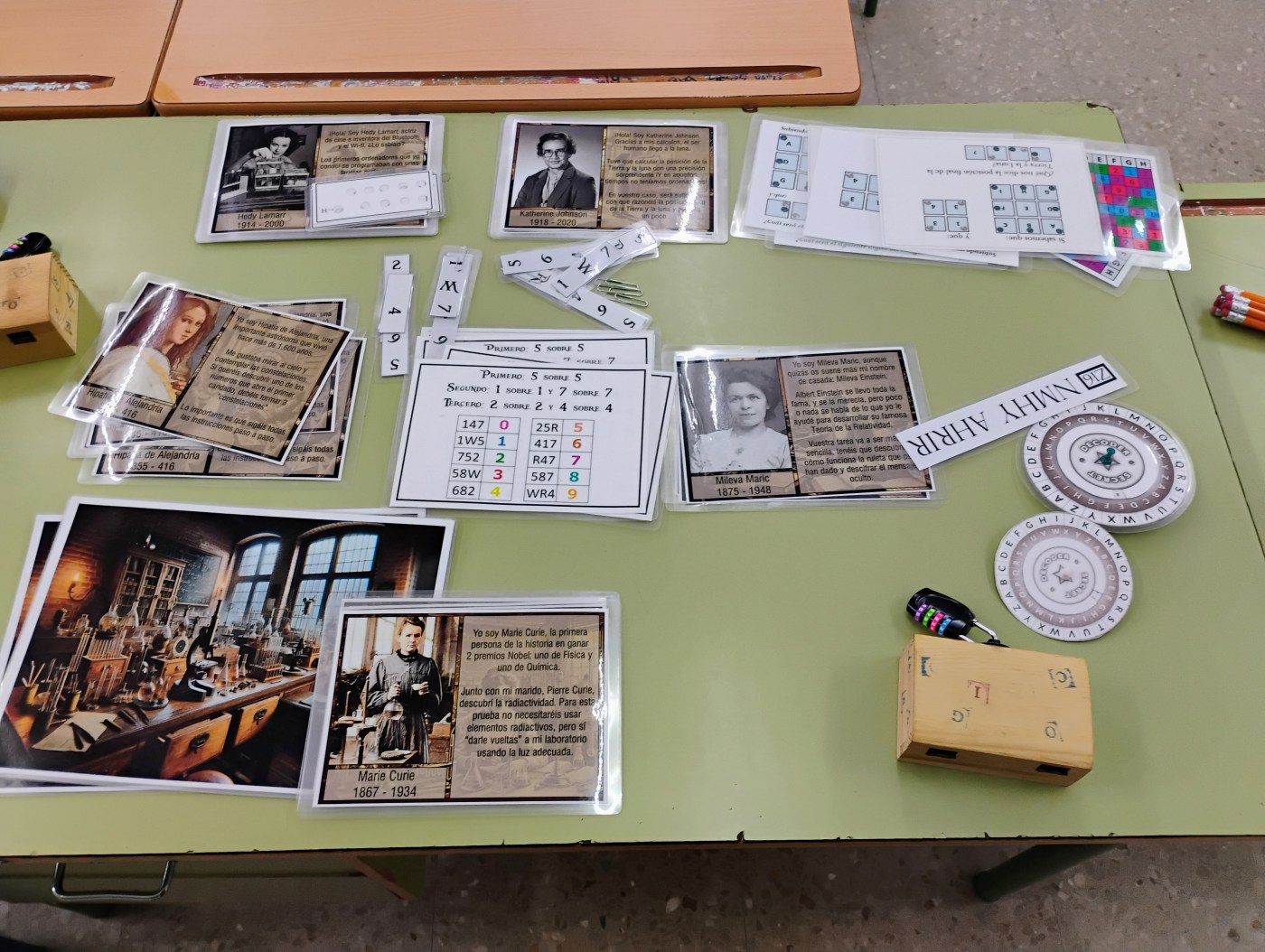 Al principio de la actividad se planteará a toda la clase cual será el objetivo final de este escape room, que será conseguir los cinco dígitos que abren una caja fuerte. Pero antes de eso, y divididos en equipos, se les planteará otro reto que consistirá en ir superando todas pruebas propuestas antes de que el reloj llegue a cero. Llevado a cabo por la mismísima Mileva Marić (Mileva Einstein), a los equipos se les irán repartiendo de una en una y a medida que las vayan superando, una serie de pruebas con las que conseguirán cuatro números de cuatro colores a abrirán un cofre (uno por equipo). Cada una de estas pruebas será presentada por una mujer cuyo papel ha sido relevante a lo largo de la historia y no siempre le ha sido reconocido. Estas pruebas consistirán: