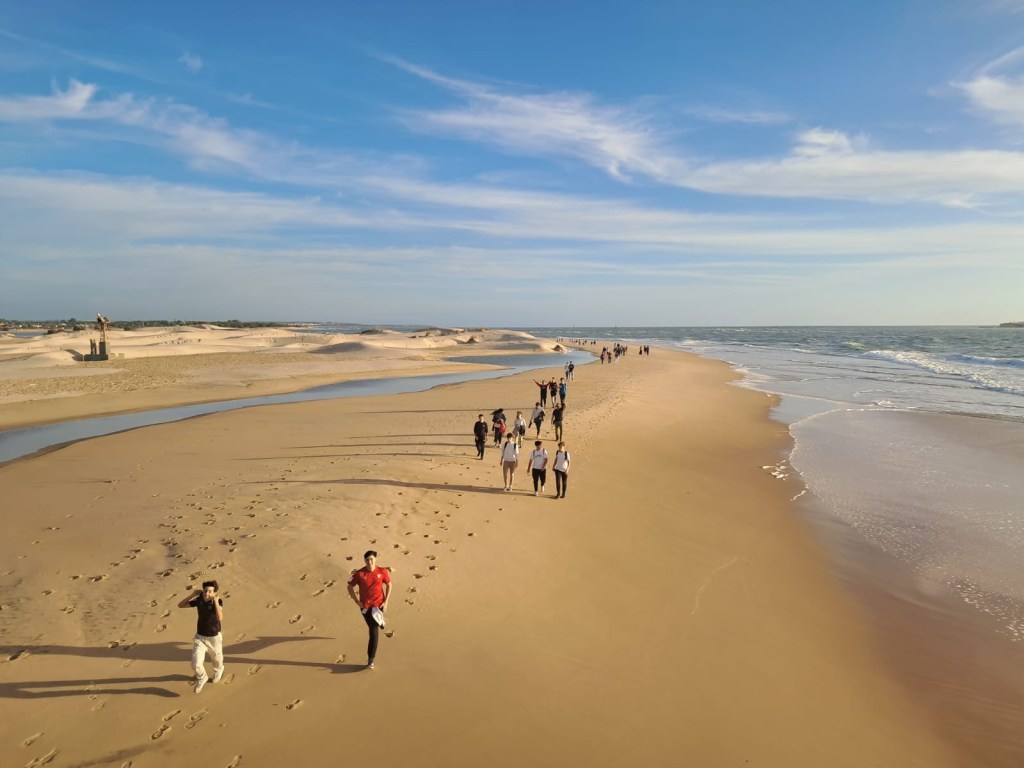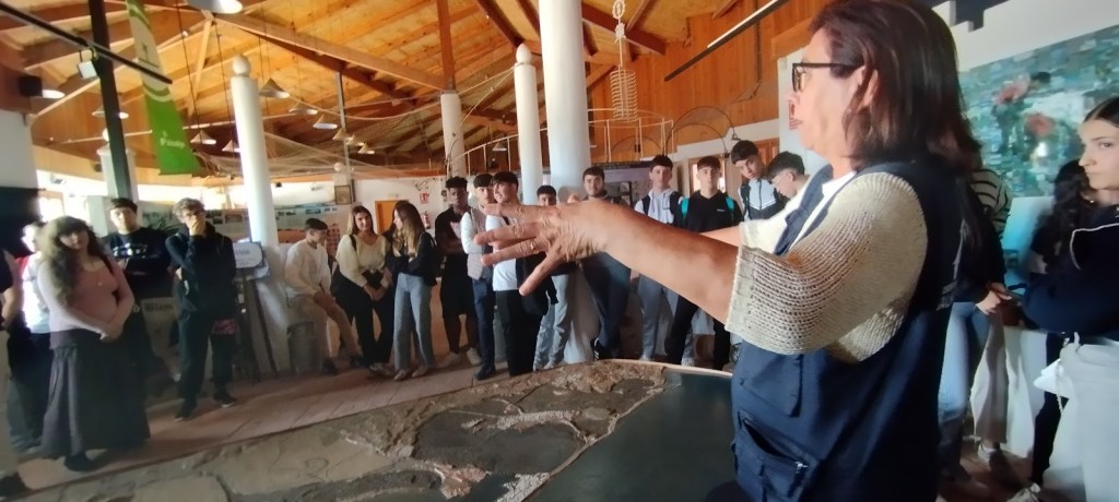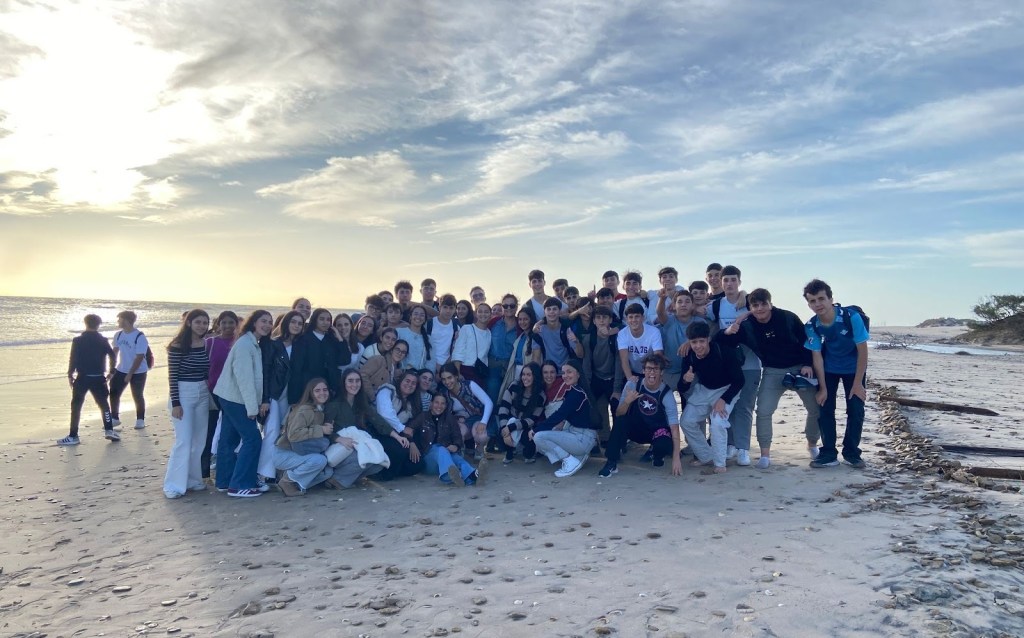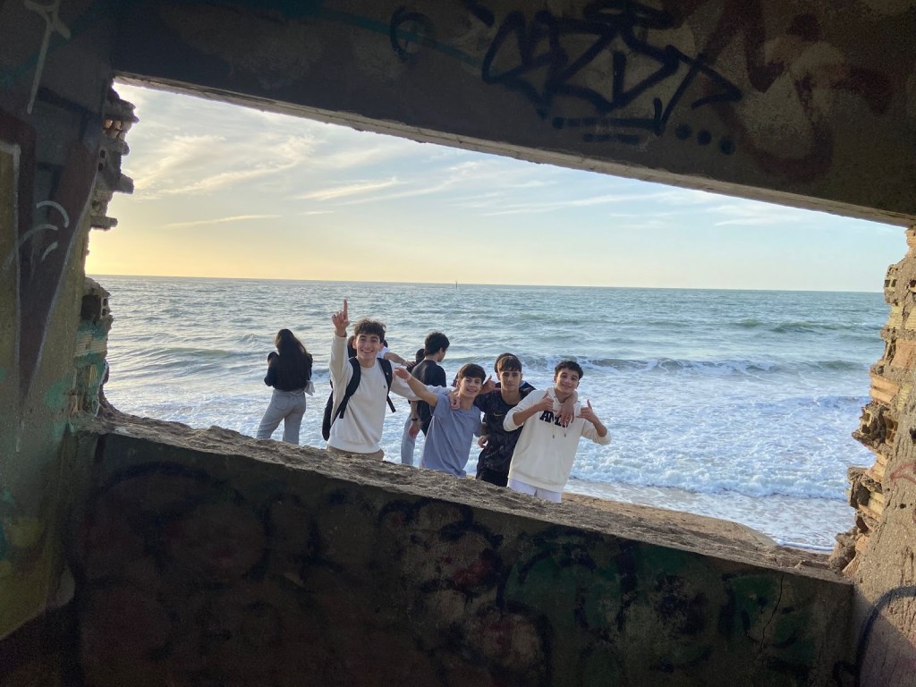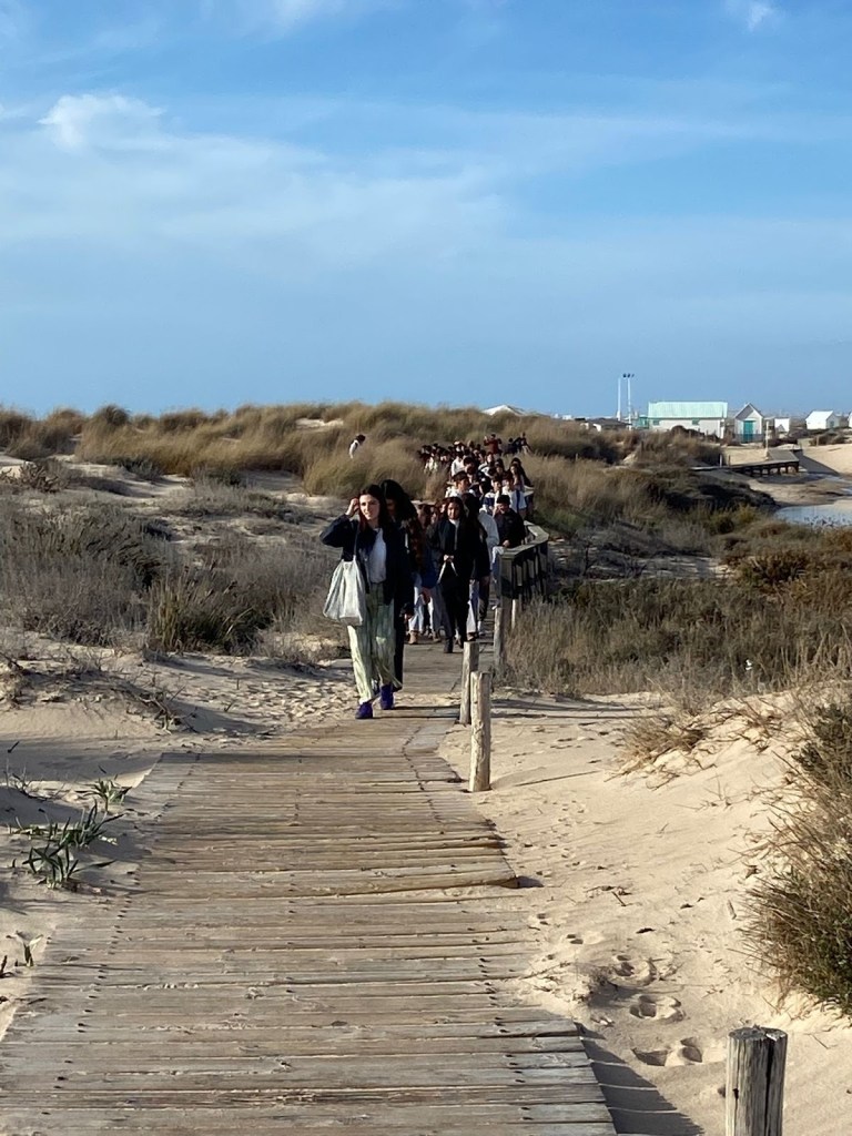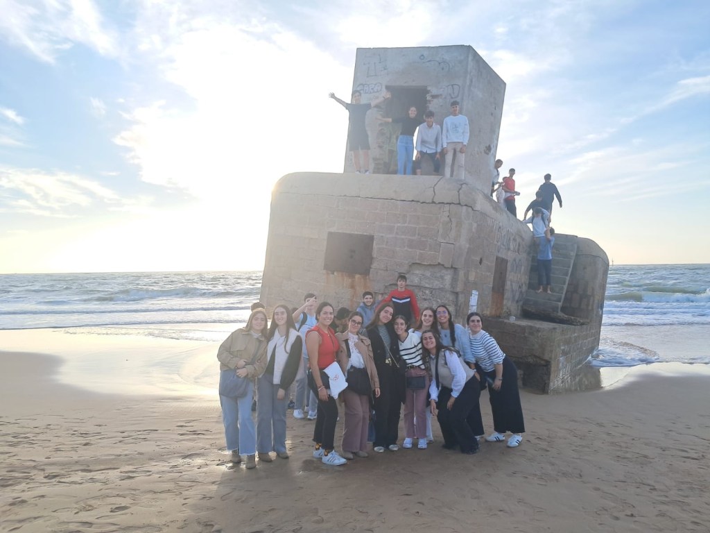 Después de comer, los dos grupos se dirigieron a la playa de Camposoto en San Fernando a hacer una ruta de senderismo que discurre paralela a las marismas del Caño de Sancti Petri, finalizando en la Punta del Boquerón, zona emblemática, declarada Monumento Natural de Andalucía en 2003. Hasta llegar allí, pudieron observar dos ecosistemas muy diferentes entre sí: las dunas y las marismas. Poco antes de alcanzar el final del recorrido, atravesaron los restos de la Batería de Urrutia (Bien de Interés Cultural) una instalación defensiva que jugó un importante papel en la Guerra de la Independencia.