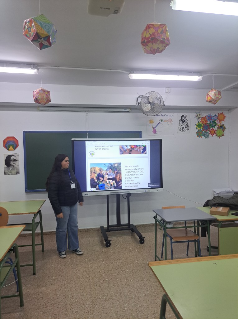 El lunes 24 fue el día de la recepción oficial en nuestro centro educativo. En el aula de EPV se hizo entrega de las acreditaciones identificativas tanto al alumnado como al profesorado. Posteriormente, algunos miembros del alumnado español hicieron unas presentaciones de la cultura y tradiciones españolas por un lado, y de nuestro instituto, por otro lado. La presentación del centro se coronó con un vídeo que había confeccionado el alumnado con anterioridad, vídeo que ya apareció en otra publicación en la web de nuestro centro. Posteriormente, se presentaron los distintos proyectos de logo elaborados por el alumnado del IES Virgen del Rosario, siendo el ganador el de la alumna L.G.A. de 2ºB, elegido para representar el proyecto “The Wonderful Poem of Nature”. Acto seguido, introduciendo al alumnado uno de los centros de interés del proyecto, Felipe Fuentesalz de WWF dio una charla cuya temática abordaba la problemática medioambiental vigente, especialmente el impacto de las acciones del ser humano en la fauna y el agua Parque Nacional de Doñana, centro neurálgico de migración de aves, y reserva del lince ibérico.