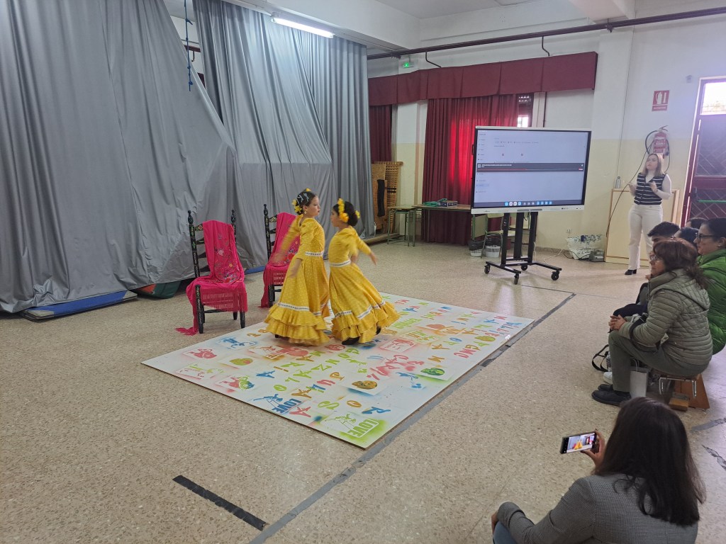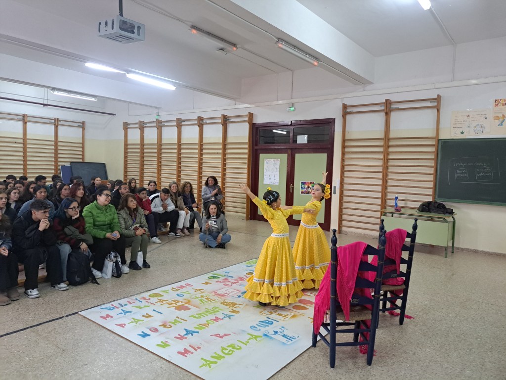 Una vez finalizada la charla se dio una muestra de arte andaluz en el SUM con un espectáculo flamenco de primer nivel. Dos niñas bollulleras de primaria, D.R.R. y S.R.P. exhibieron su arte haciendo muestra de dos tipos de sevillanas: sevillanas flamencas primero para posteriormente deleitar con sevillanas con mantón.