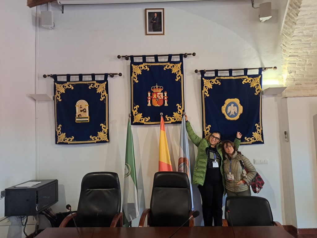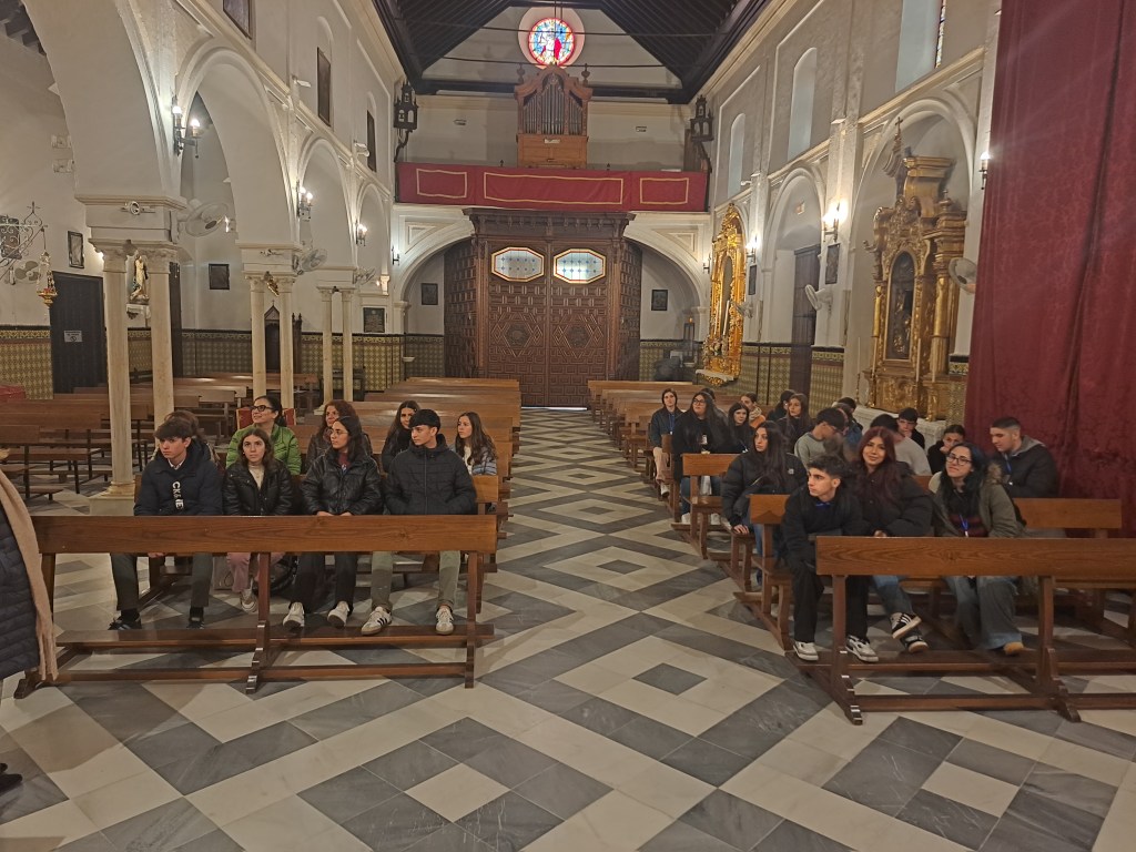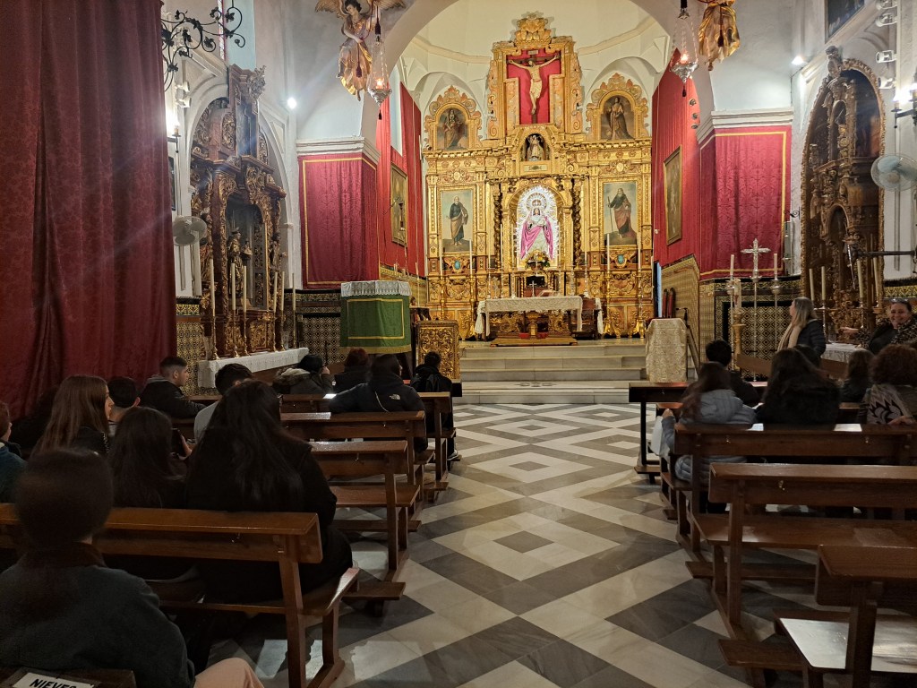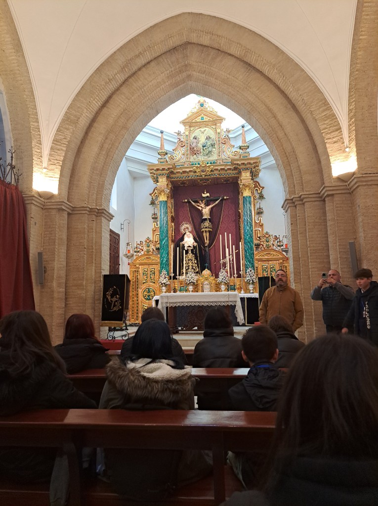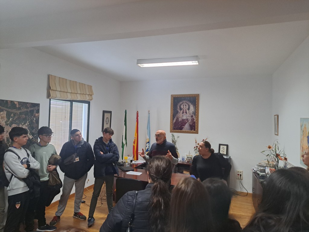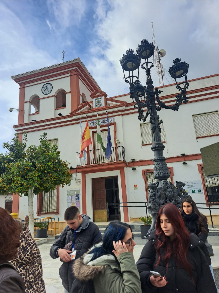 Tras un más que merecido desayuno, el alumnado emprende camino al ayuntamiento, donde fueron recibidos por el Teniente de Alcalde D. Manuel Ortiz Soriano y Doña Esperanza Rivera Ríos, Delegada de Educación y Medio Ambiente. El teniente de alcalde explicó al alumnado lo que es un ayuntamiento en España, así como una somera explicación del funcionamiento de este órgano local de gobierno. Acompañados de Doña Esperanza, visitaron a continuación la Iglesia Parroquial Santa María de las Nieves y las Capillas de la Vera+Cruz y de la Soledad respectivamente, donde fueron amablemente recibidos por una representación de sus juntas de gobierno; que hicieron una breve reseña de su mucha historia y sus imágenes titulares.