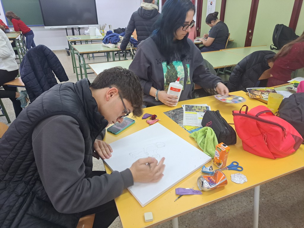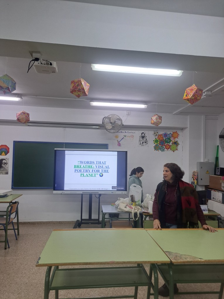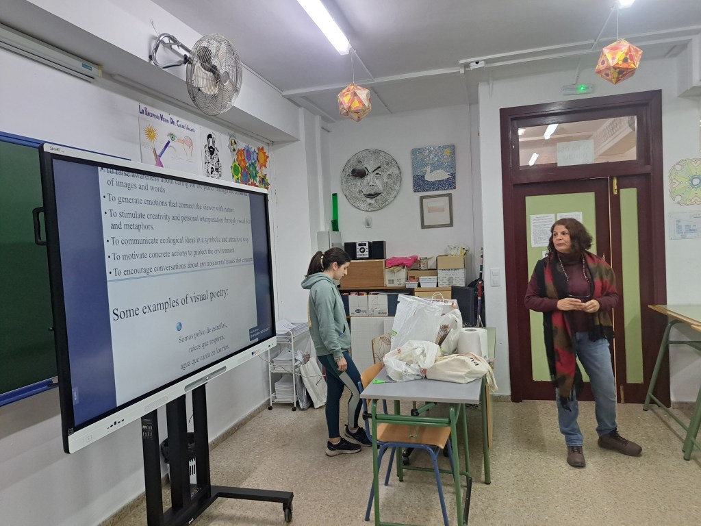 El jueves 26 se despierta con pinceladas algo más académicas pues el alumnado sardo tiene la oportunidad de asistir a clases acompañando a sus anfitriones españoles a primera hora de la jornada. Luego a las 9:00 se desarrolla un taller de Poesía Visual. La poesía visual tiene sus orígenes en los poemas figurativos ya existentes en la era antes de Cristo; aunque se retomaran en el siglo XIX y principios del XX. Esta forma experimental que fusiona texto e imagen fue utilizada por nuestro alumnado para expresar su denuncia acerca de la problemática medioambiental vigente.