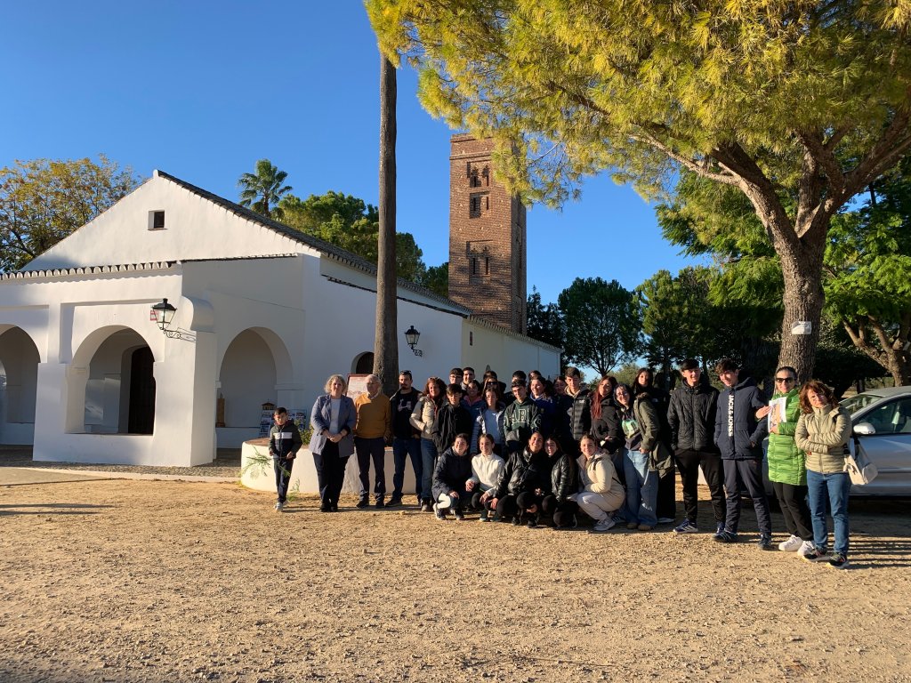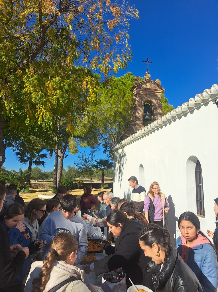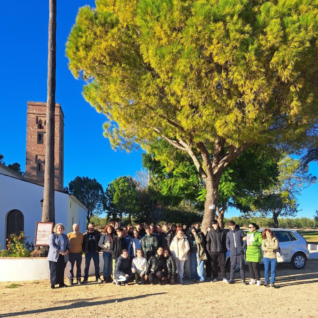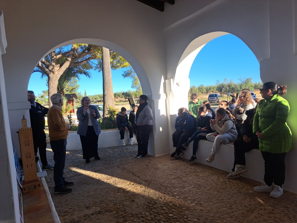 Una vez terminado el circuito se emprende un camino a pie hacia Cuatrovitas. Allí esperaban las familias del alumnado español; quienes habían preparado un delicioso ágape para almorzar. El almuerzo sirvió de convivencia y de “fiesta de despedida” pues, al día siguiente, el grupo ítalo volvía a su país por la tarde. Una vez concluida la comida, tuvo lugar una píncela cultural. D. Fernando Rodríguez Fernández, de Bollullos de la Mitación, sirvió de guía para explicarles a los presentes la historia del enclave donde se hallaban; de gran significancia espiritual, devocional e histórica para el pueblo de Bollullos de la Mitación. Así mismo, la Alcaldesa de este pueblo vecino, Doña Clara Monrobé Cárdenas, quiso arropar al grupo Erasmus en su visita al monumento, declarado Bien de Interés Cultural.