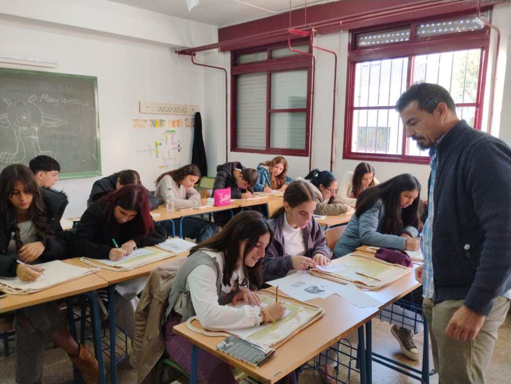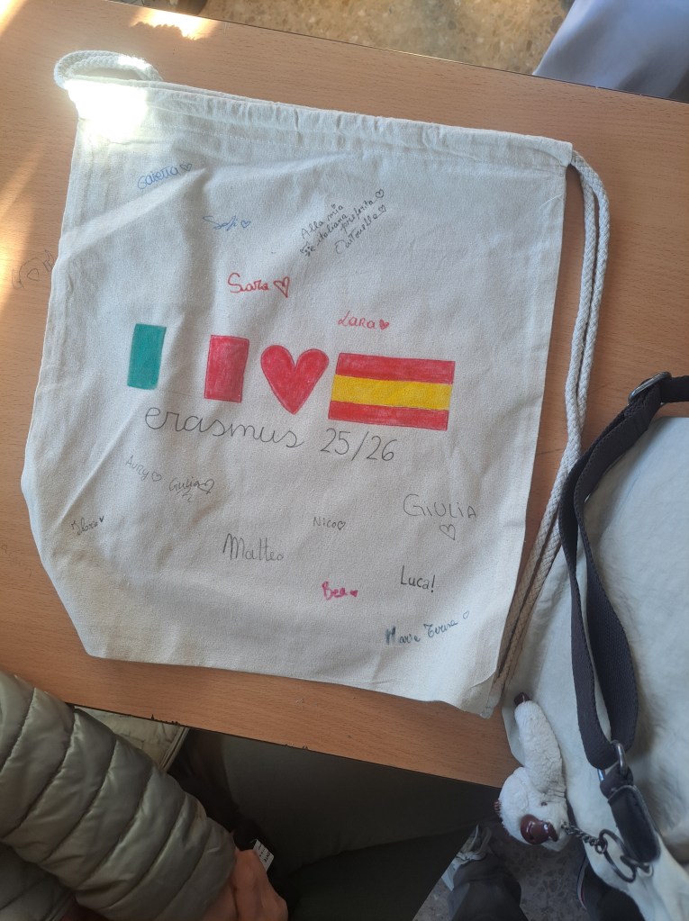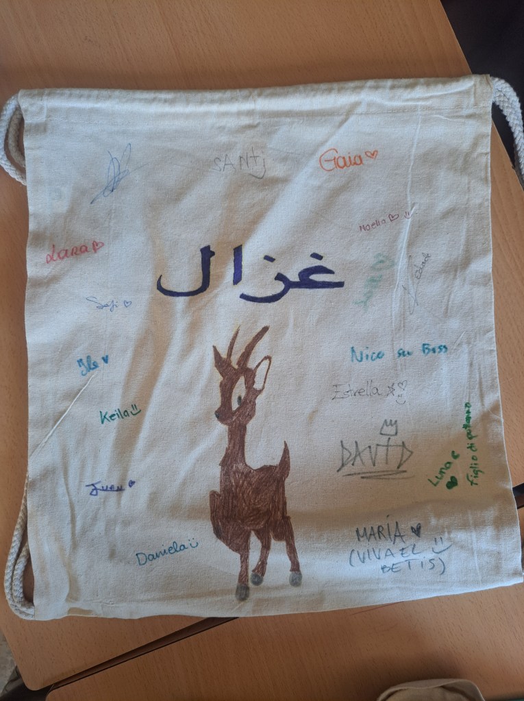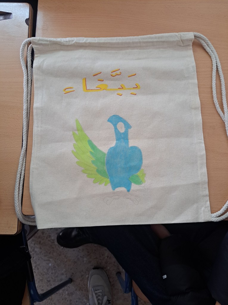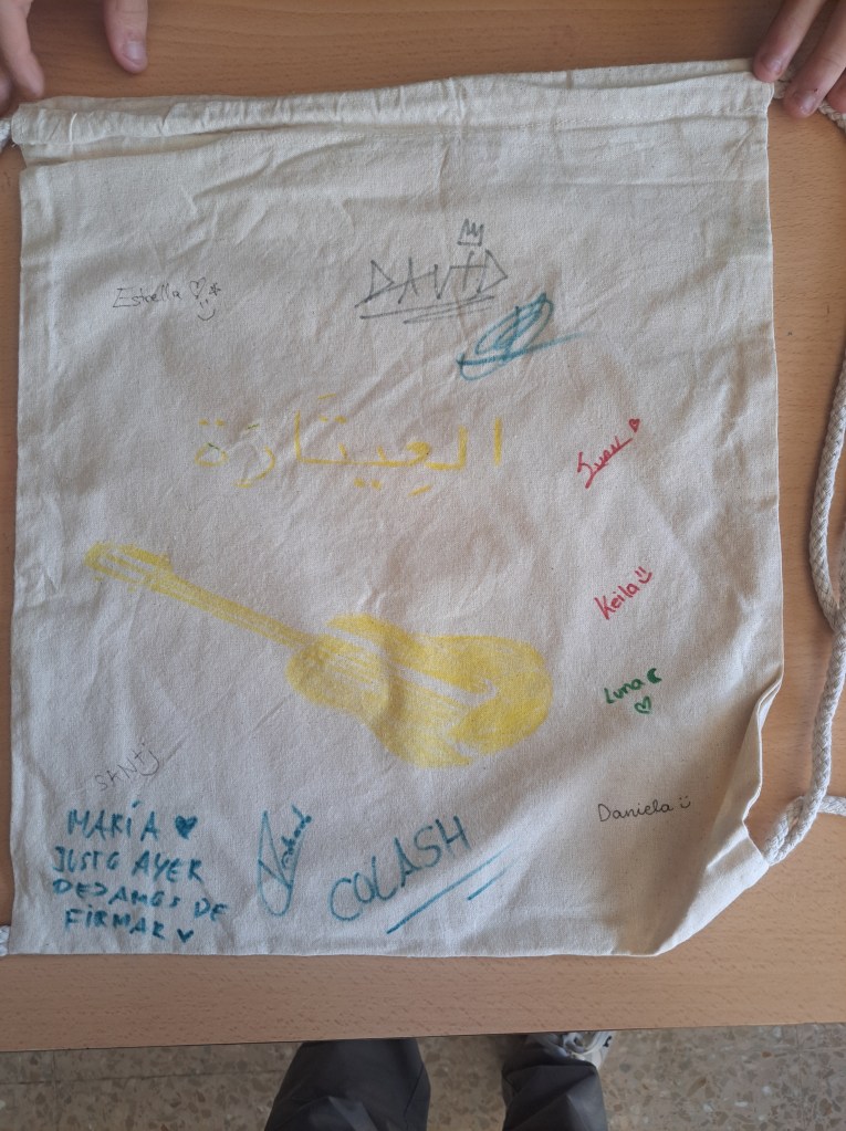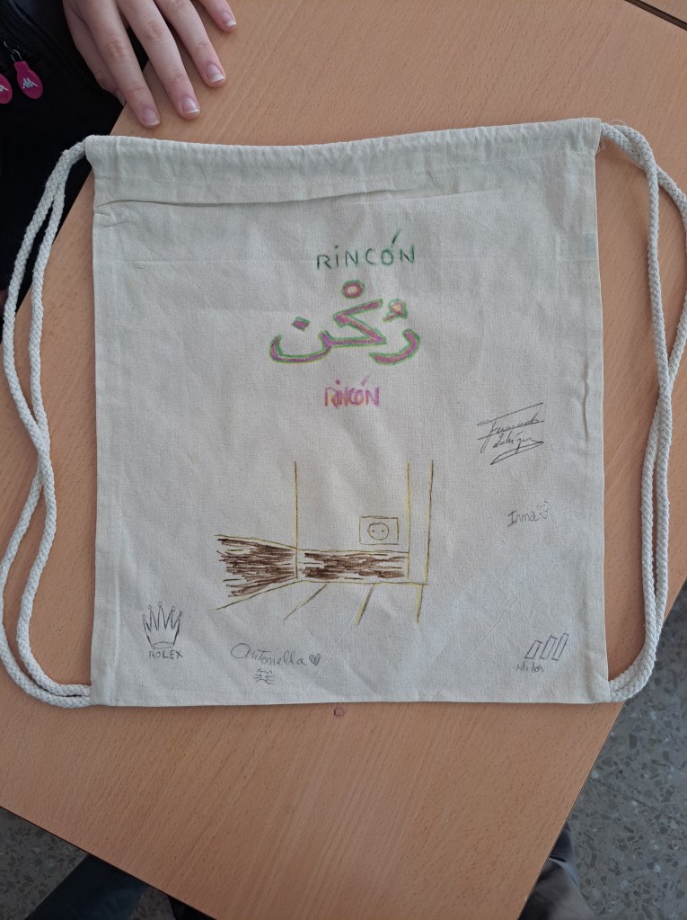 El viernes, último día de la movilidad, después de asistir nuevamente a clases; tuvo comienzo el “Taller de Arabismos”. Este taller fue guiado por el profesor de Inglés Fernando Rodríguez Moreno, quien explicó en primer lugar el concepto de arabismos para después proceder a desglosar la gran cantidad de los mismos existentes en nuestra rica lengua española. Acto seguido explicó en qué consistía el taller y las dinámicas: El alumnado se puso libremente en grupos, aunque a cada uno/a se le facilitó una bolsa de tela reciclada. Sobre las bolsas, el alumnado plasmó (calcó) las palabras árabes de las que se originan nuestros arabismos, así como un dibujo ilustrando la palabra utilizando para ello unas plantillas y papel de calca.
