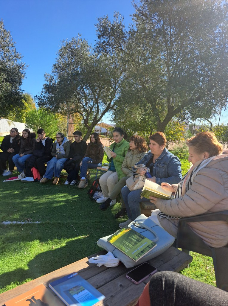 Una vez finalizado el taller el grupo se dirigió al aula verde de nuestro centro. Allí, Doña María Reyes Ramos Mantis, abuela de uno de nuestros alumnos, protagonizó el espacio “Poetry in the environment”. Estuvo hablando de sus inquietudes poéticas y cómo, en su caso, la poesía le afloraba en cualquier momento inesperado. Era esos momentos de inspiración cuando aprovechaba para anotar lo que pasaba por su mente, para fraguarlo en un poema. Aunque siempre ha escrito, se dedicó a esto, según ella, ya tarde, llegando incluso a tener un libro de poesía en el mercado. Nos leyó unos versos de su producción, de temática miscelánea, y luego los libros fueron circulando, de modo que la mayor parte del alumnado recitó uno de sus poemas.