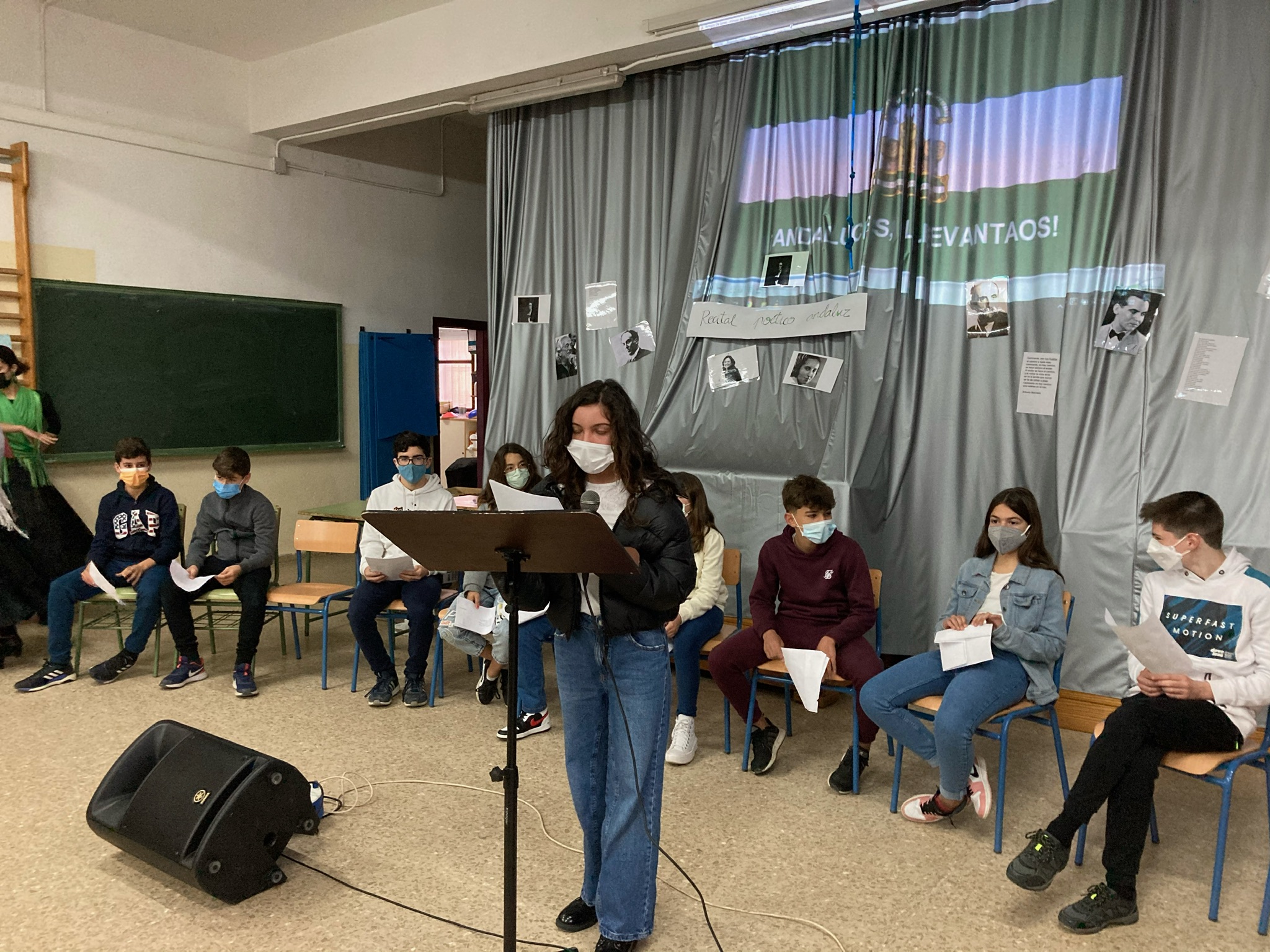 Con motivo de la celebración del Día de Andalucía, los alumnos de 1º B y C, han participado en un recital de poesía, organizado por el Departamento de Lengua Castellana y Literatura dentro de las actividades enmarcadas en el programa ComunicA. El alumnado ha recitado poemas de autores andaluces como Rafael Alberti, los hermanos Machado, Luis de Góngora, Manuel Altolaguirre, Ángeles Asensio y otros grandes poetas nacidos en nuestra tierra.