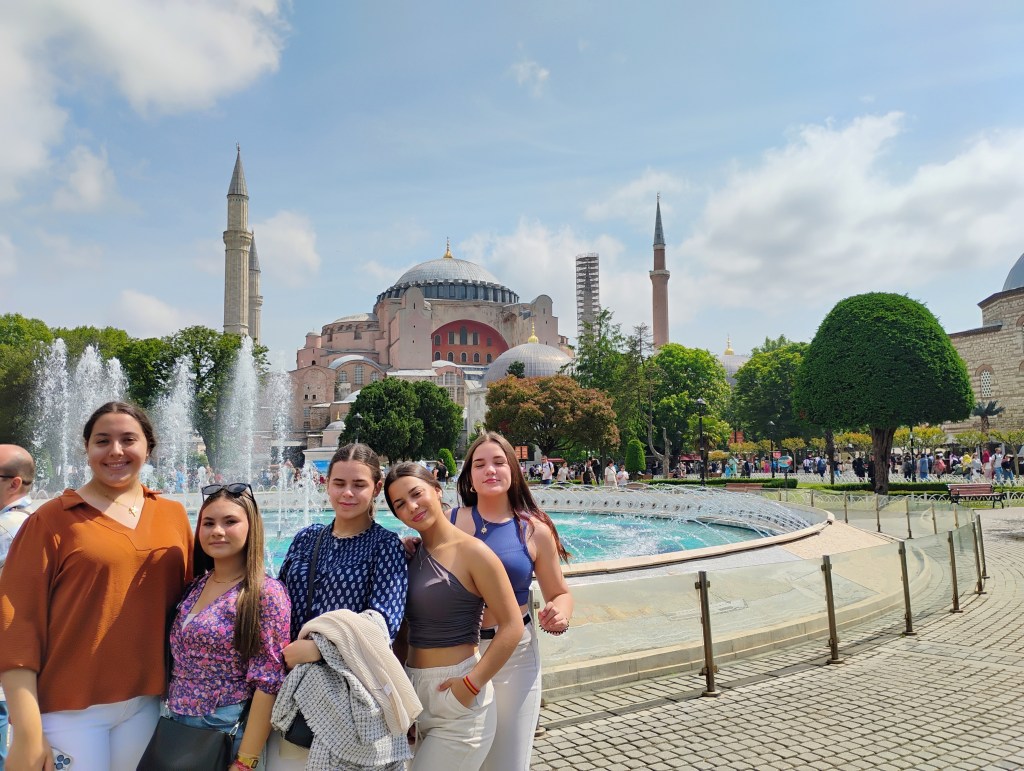 Durante la semana del viernes 24 de marzo hasta el 1 de junio, el profesor Alejandro García e Inma Navarro como coordinador/a del proyecto han viajado junto con cinco alumnas de 4º ESO que han participado durante todo el curso en el proyecto. Los dos primeros días los pasamos en Estambul donde pudimos conocer los lugares turísticos más destacados de la ciudad como el Grand Bazar, la mezquita Santa Sofía o la mezquita Azul. Por otro lado, también disfrutamos de un crucero por el Bósforo para enseñarles a nuestras alumnas la diferencia entre la parte europea y la asiática donde se encuentra la ciudad. Muammer, el profesor coordinador del proyecto en Turquía, nos iba explicando un poco sobre lo que íbamos viendo. En estas visitas las alumnas ya empezaron con el uso del idioma ya que tuvieron que desenvolverse en diferentes situaciones reales de la vida cotidiana como comprar en una tienda, pedir algo, etc en inglés.