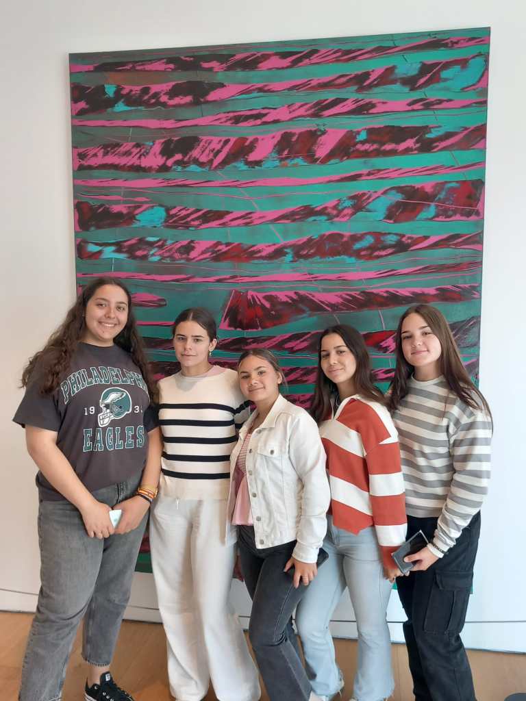 Para bajar un poco los churros con chocolate, acompañados por una representación de la Comisión Erasmus, se hizo una ruta por los espacios verdes de nuestro centro: el aula verde, el huerto, el aparca bicis ecológico, el mural de Frida Kahlo y los bancos multicolor. La ruta acabó en el aula de plástica con nuestro compañero Alejandro García, quien explicó la línea decorativa de nuestro centro y el propósito de sus creaciones artísticas junto el alumnado.